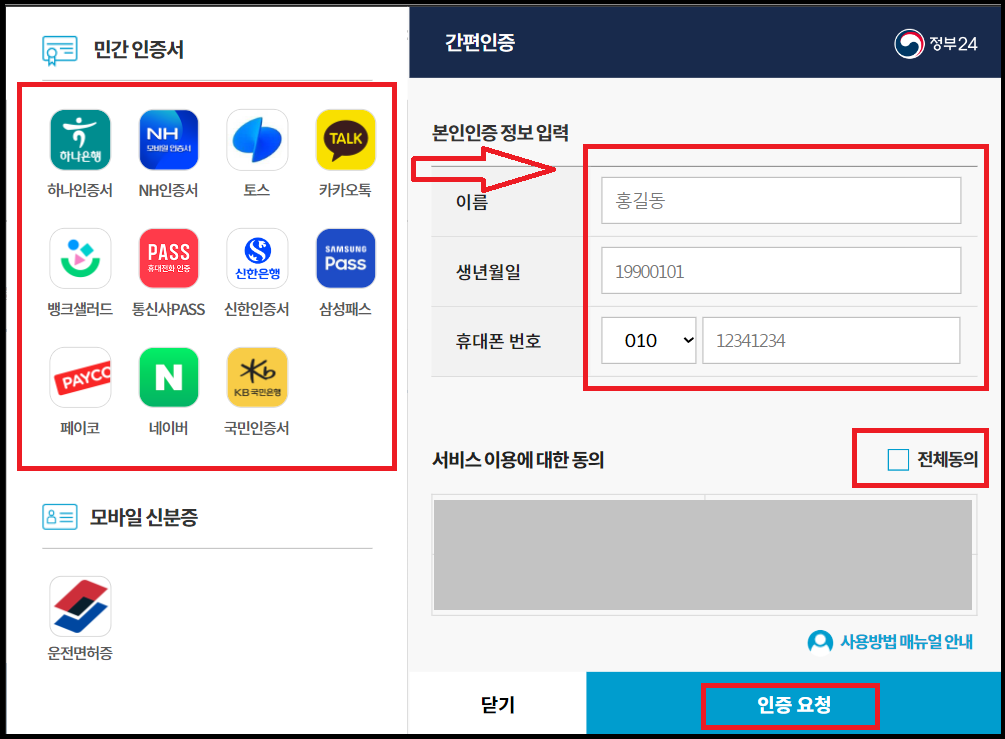 휴대폰 본인확인으로 할 수 있는 간편 인증 로그인이나 공인인증서 등록을 통한 인증서 로그인을 할 수 있습니다.