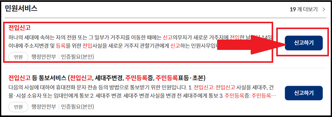 그럼 전입신고에 관한 민원서비스 종류가 나오는데, 여기서 전입신고 신고하기를 클릭합니다.