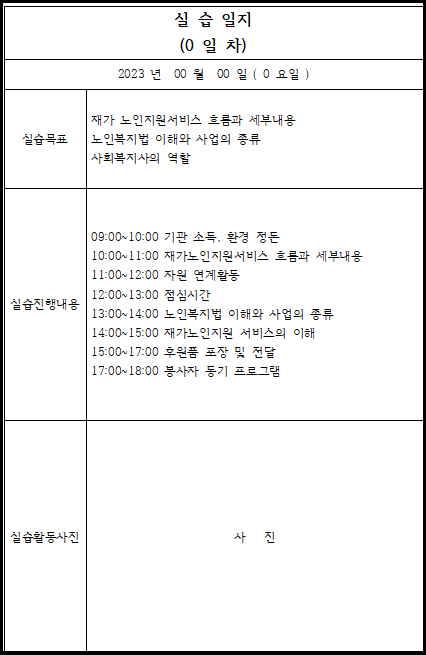 이전 글에서 실습일지 작성 시 유의사항에 대해서 알아봤었는데요. 이번에는 각기 다른 실습일지 작성법을 재가노인지원센터를 예시로 4가지의 예문을 만들어 봤습니다.