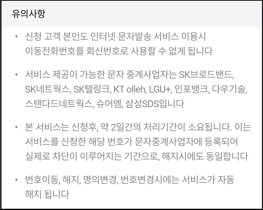 ● 본 서비스는 신청 후 약 2일간의 처리기간이 소요됩니다. 이는 서비스를 신청한 해당 번호가 문자중계 사업자에 등록되어 실제로 차단이 이루어지는 기간으로 해지 시에도 동일합니다.