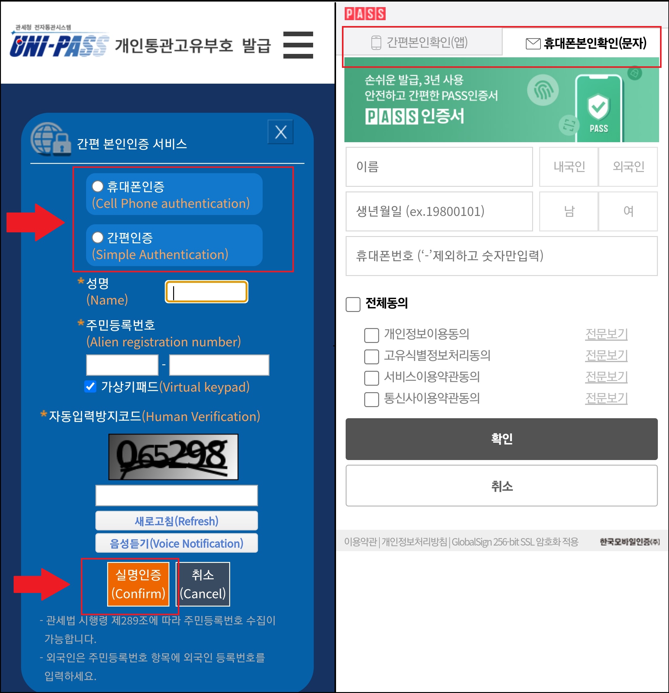 - 본인 개인정보를 입력한 후, PASS나 문자로 간편 본인인증과정을 완료합니다.