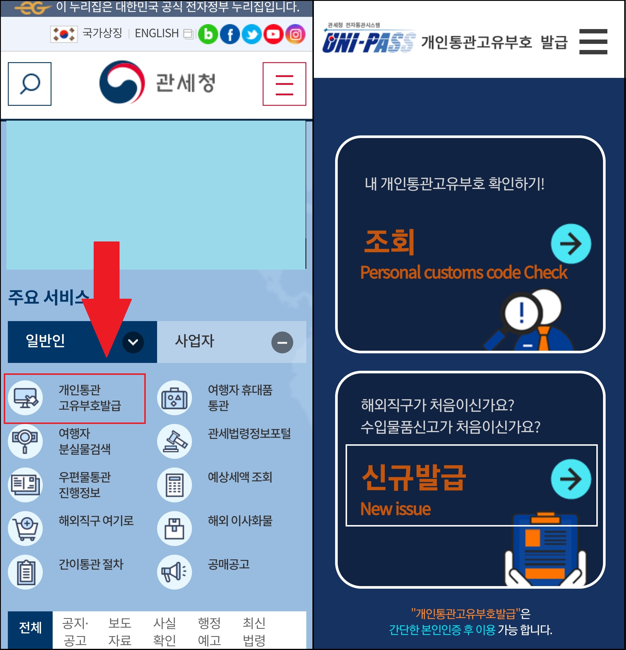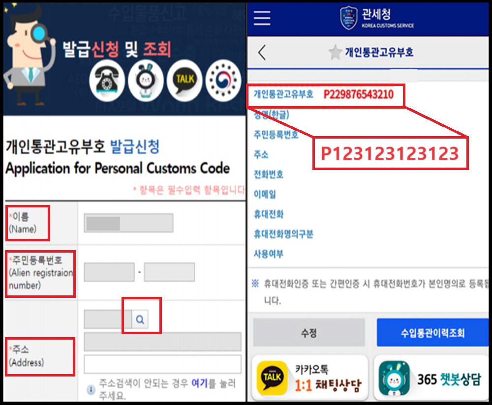 (웹사이트에서 국세청 개인통관부호를 검색하거나 모바일 관세청 앱 접속)