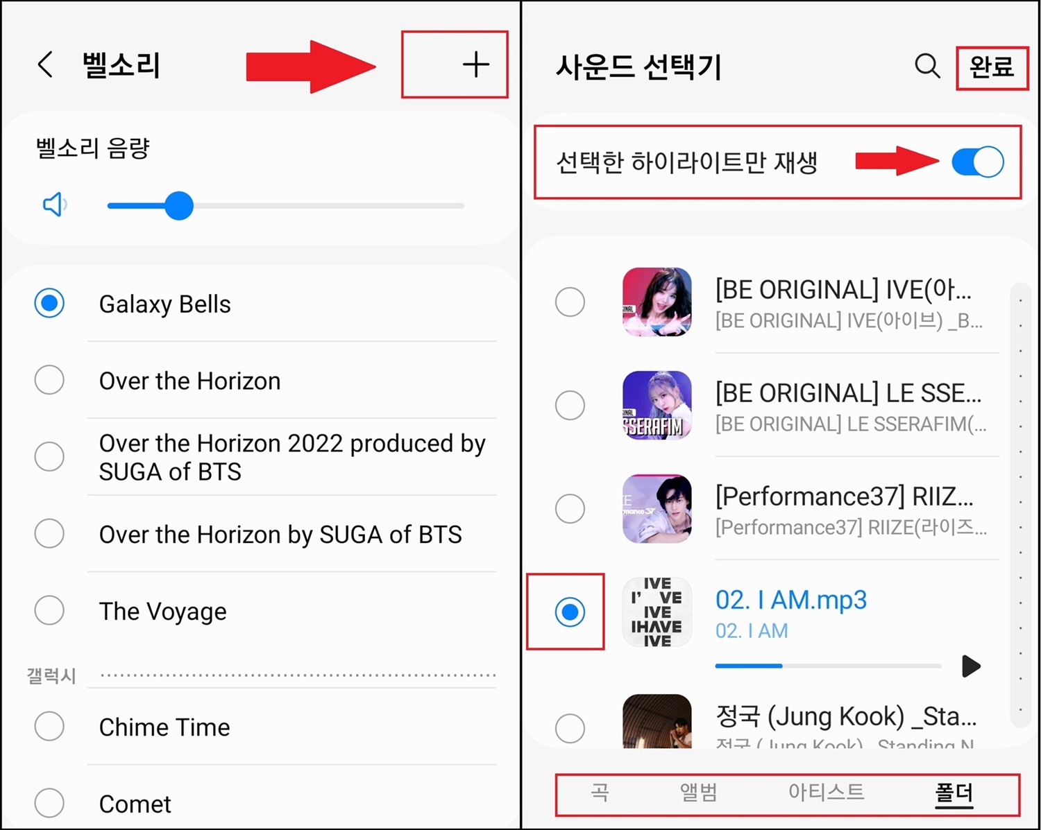 - 마지막으로 하면 상단의 '선택한 하이라이트만 재생'을 활성화시키고 완료를 누르면 벨소리가 설정됩니다.