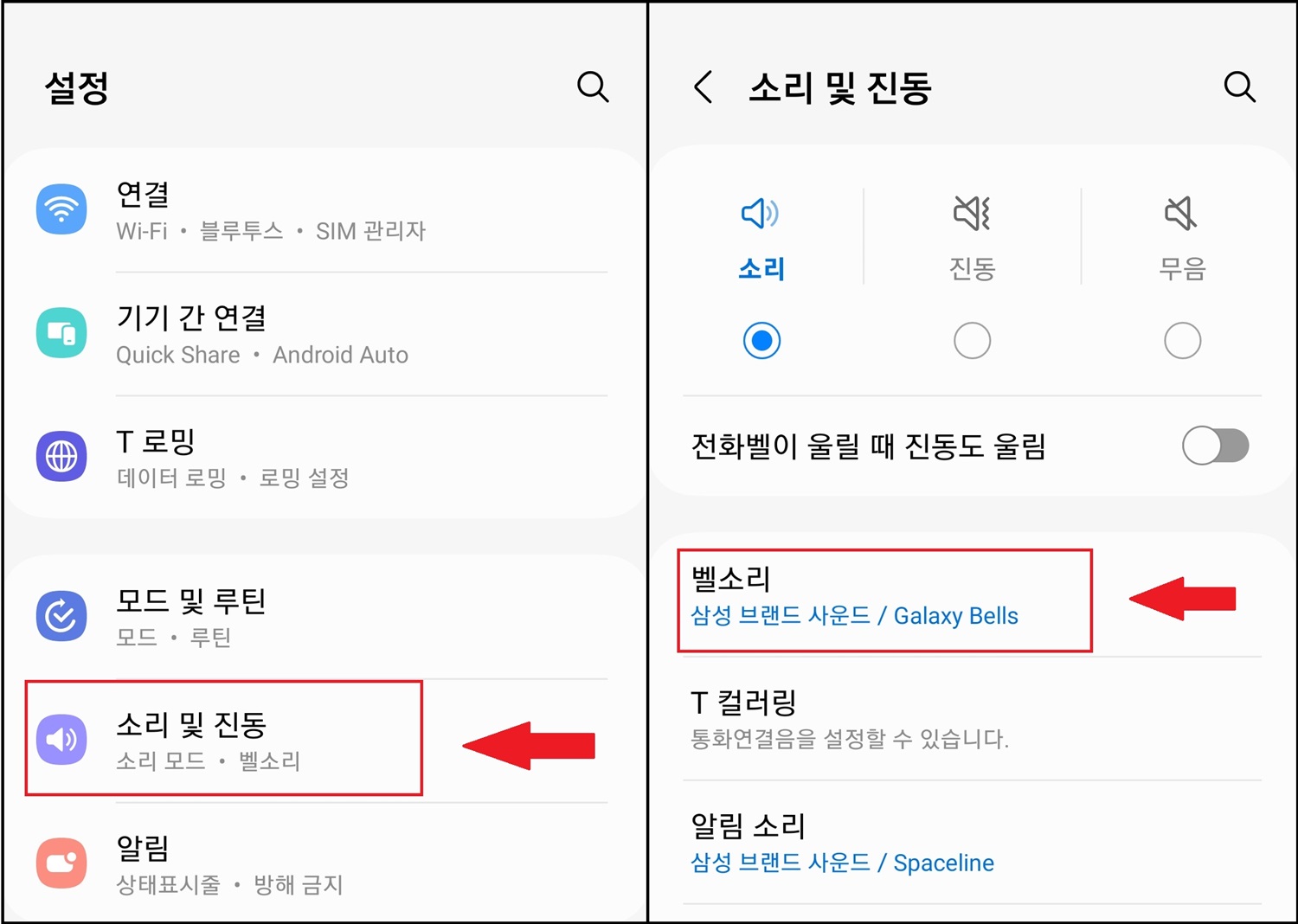기본적으로 벨소리를 설정하는 건 엘지나 삼성이나 같습니다.