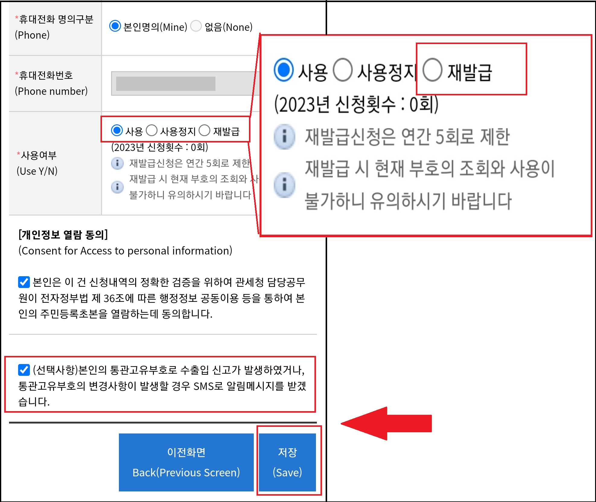 (※ 이 부분 설정에서 '재발급'을 활성화하면 기존에 사용하던 번호는 없어지고 새 번호가 부여됩니다. 재발급 신청은 연간 5회 가능합니다. 여기서 유의할 점은 재발급 시 기존에 사용하던 번호의 조회와 사용이 불가하다는 것입니다. 하지만 정기적으로 번호를 바꿈으로써 도용방지 효과가를 볼 수 있습니다. )