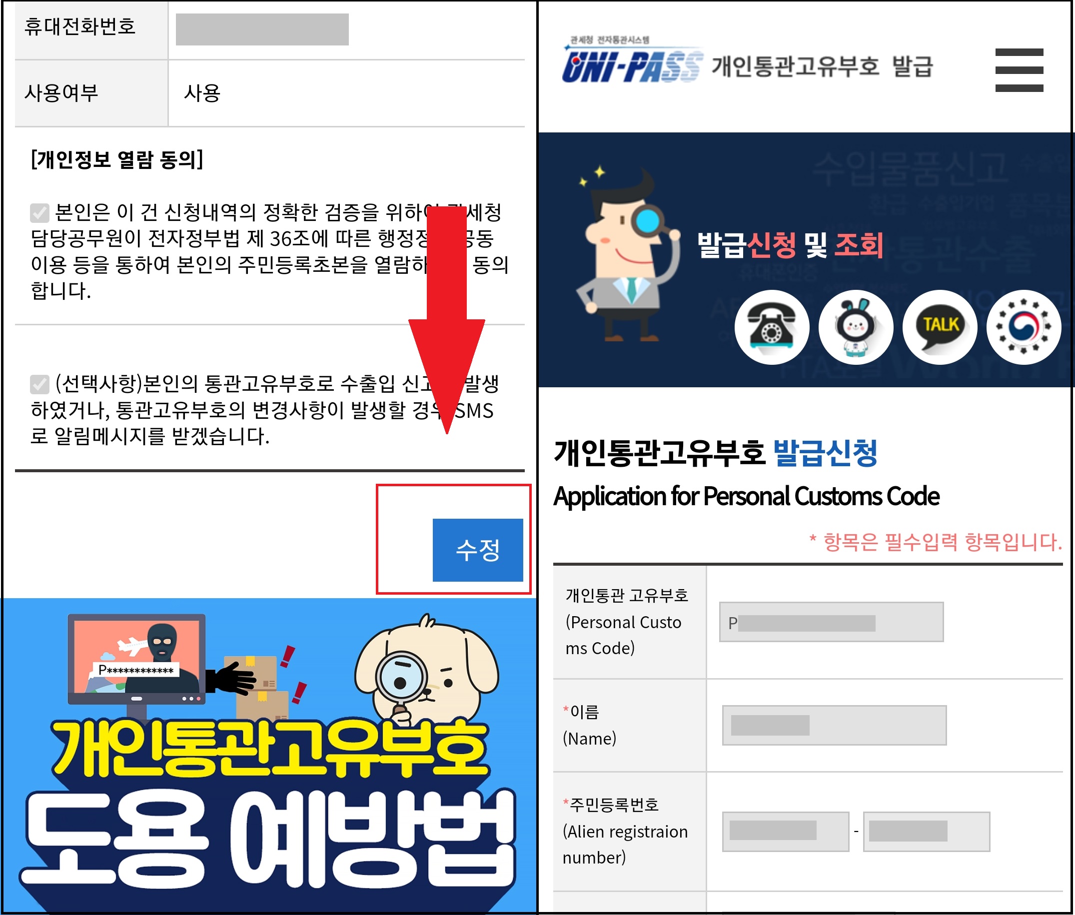 - 이 중 선택사항 부분이 관세청 알림으로, 이 부분을 체크를 하면 고유부호 사용에 관해 알림을 받을 수 있습니다.