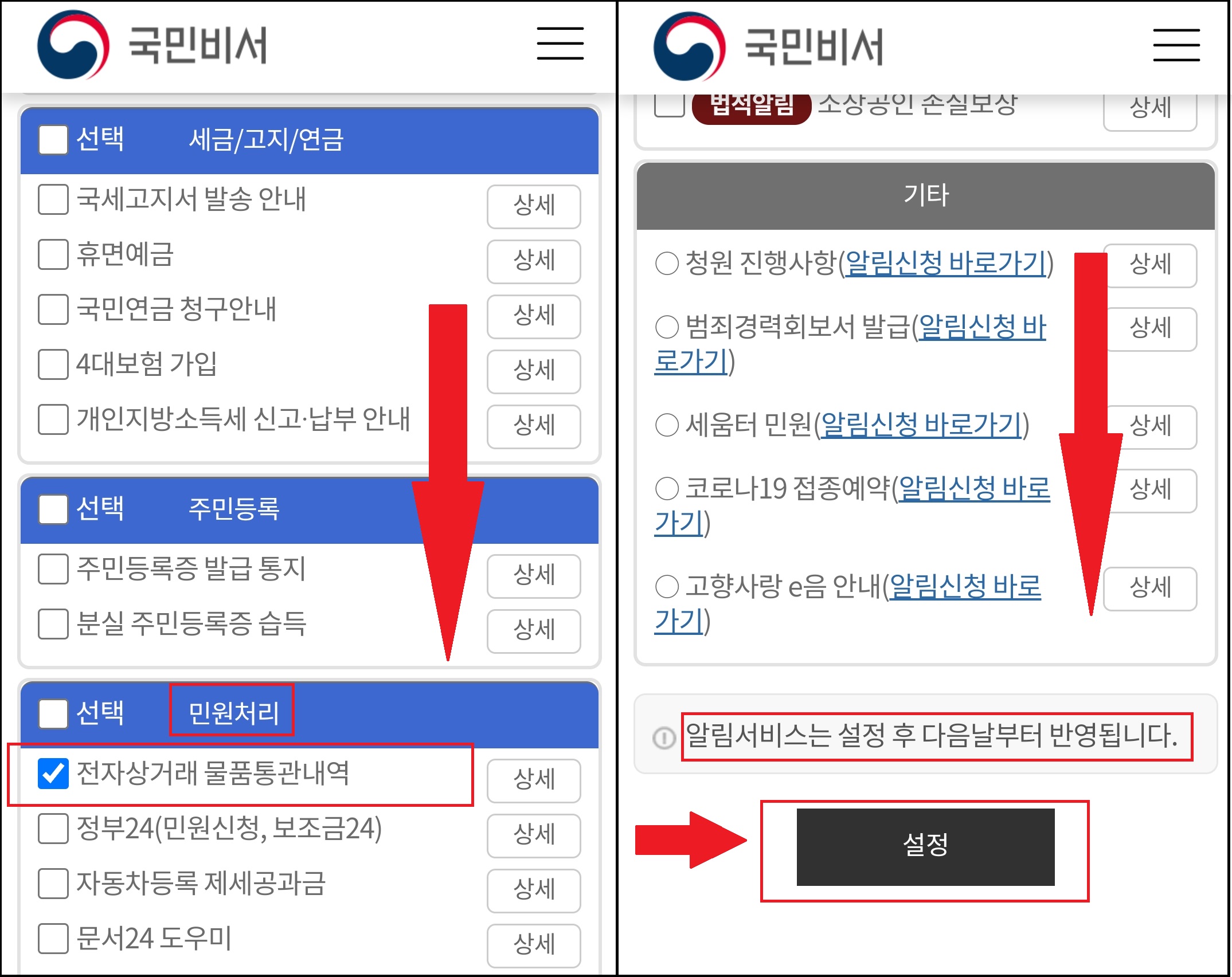 - 알림설정 중 민원처리 부분에 전자상거래 물품통관내역에 체크를 합니다.