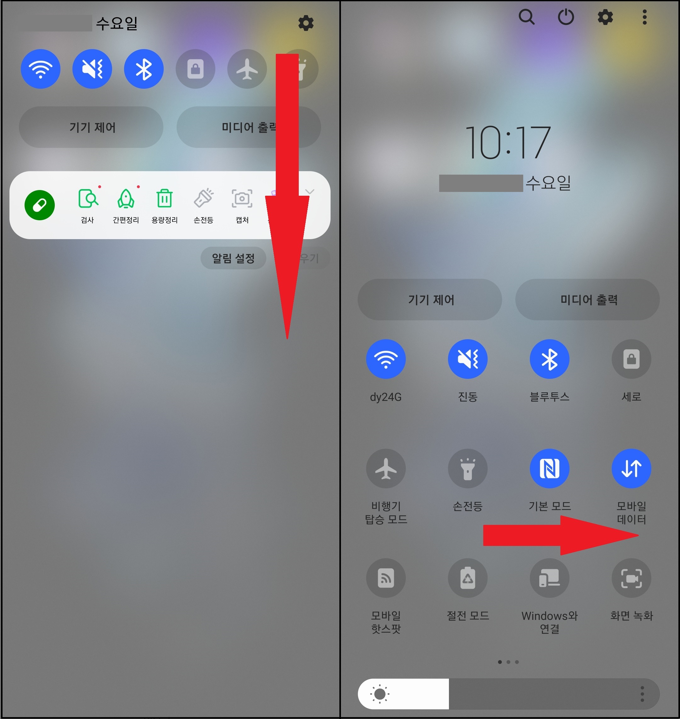 1) 스마트폰 상단에 빠른 설정창을 아래로 스크롤합니다.