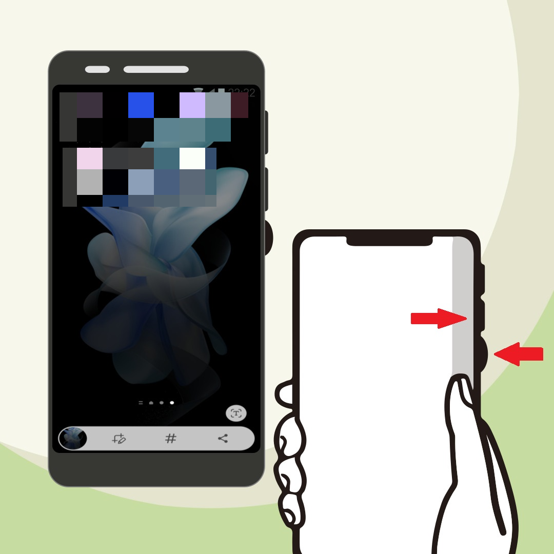 최근에 출시되는 스마트폰은 전원 버튼과 음량 버튼이 대부분 오른쪽에 위치하고 있습니다. 하지만 어떤 스마트폰들은 왼쪽과 오른쪽에 음량버튼과 전원 버튼이 나뉘어 있기도 합니다. 이들 버튼을 이용해서 화면캡처를 하는 방법은 전원버튼과 음량 버튼의 하단(소리 줄임) 버튼을 동시에 눌렀다 떼면 화면 캡처를 할 수 있습니다. 이 경우 버튼을 누르는 속도 때문에 전원 버튼만 눌러진다거나 음량 버튼만 눌러질 수 있으니 여러 번의 연습으로 동시에 눌렀다 떼는 속도를 조절해야 합니다.