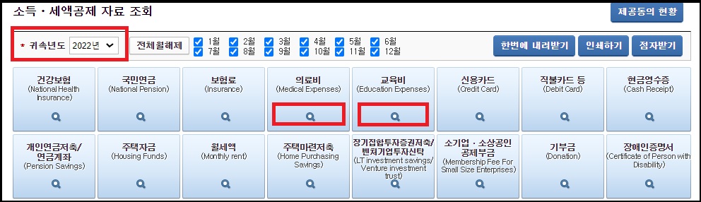 왼쪽 상단에 귀속년도를 확인하고 의료비나 교육비 항목의 돋보기 모양을 클릭합니다.