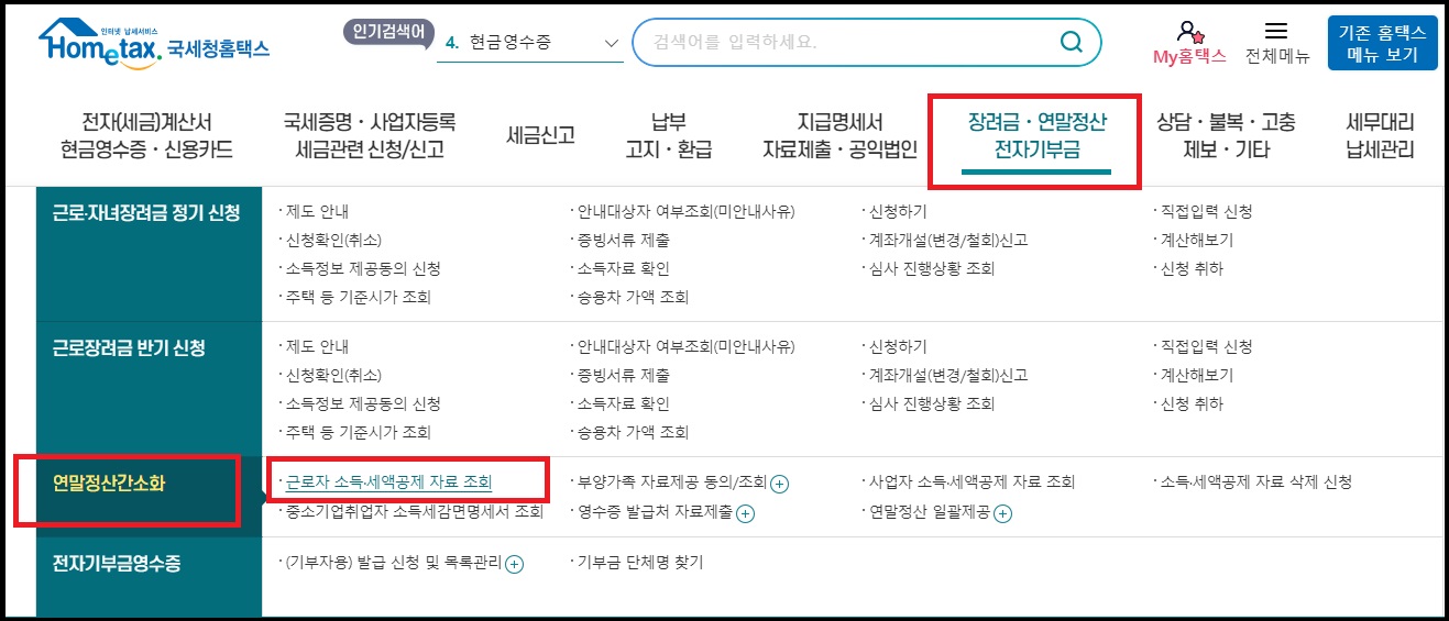 홈화면 상단 목록 중 연말정산에서 상세항목인 연말정산간소화 탭의 근로자 소득·세액공제 자료 조회를 클릭합니다.