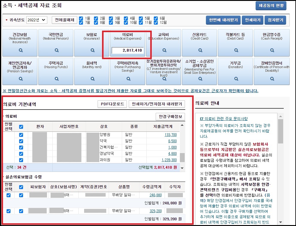 돋보기를 클릭하면 목록 아래 의료비 기본내역과 실손의료보험 수령액이 나타납니다.