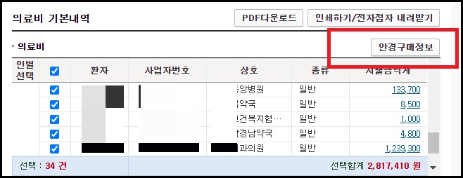 하지만 안경은 따로 영수증을 제출해야 하는데요. 의료기관이 아니기 때문입니다. 그리고 영수증 제출 후 영수증이 잘 올라갔는지 확인하려면 의료비내역 옆 안경구매정보를 클릭하면 알 수 있습니다. 그 외 보청기나 장애인보장구의 경우도 따로 영수증을 제출하면 상세내역에서 확인할 수 있습니다.