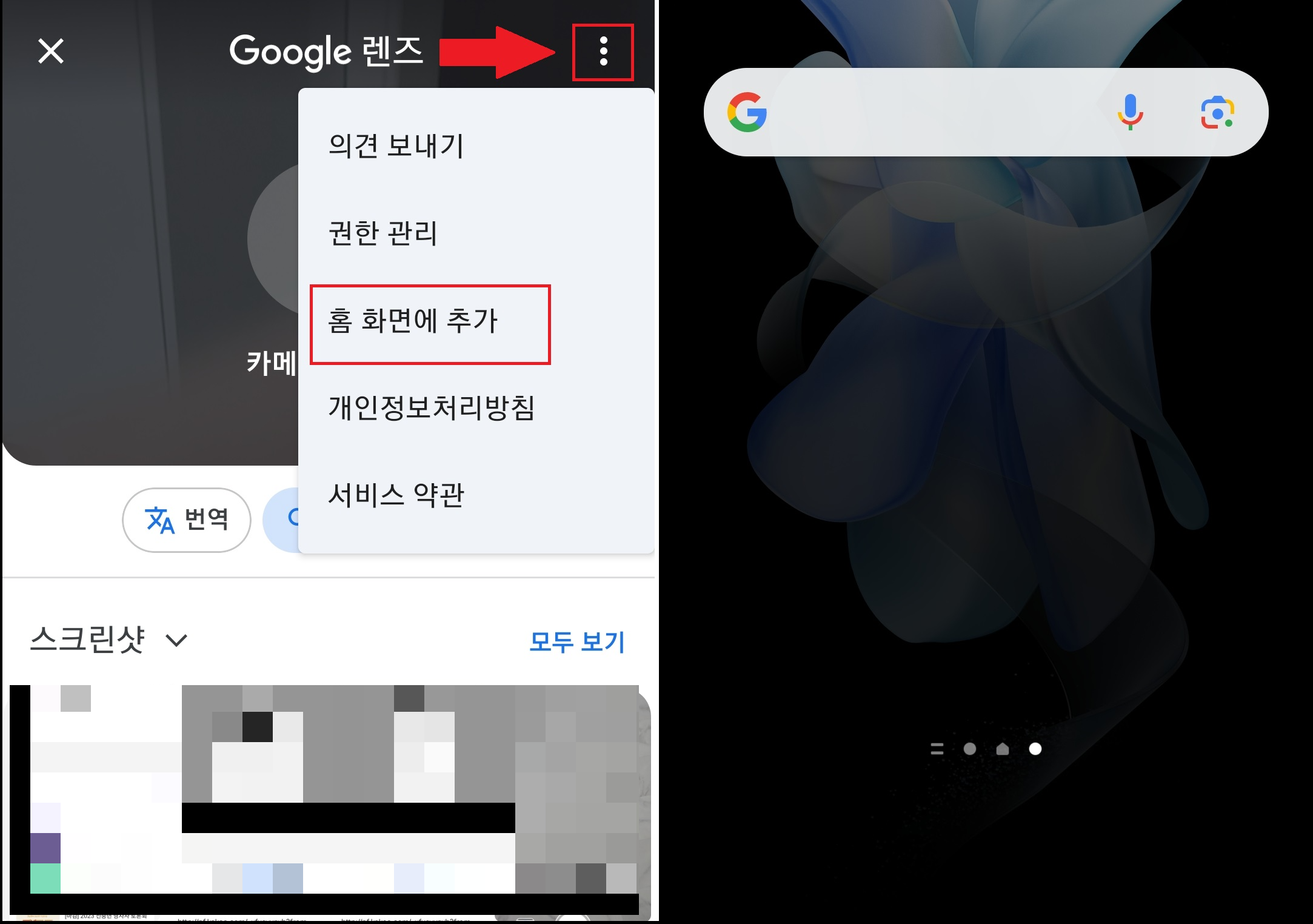 그리고 하나 더, 카메라 아이콘을 눌러 들어간 상태에서 구글렌즈 옆 점 세 개를 누르면 홈화면에 추가할 수 있는 항목이 나옵니다. 이를 클릭하면 홈화면에 바로가기 아이콘(위젯)이 생성됩니다. 이렇게 구글 검색창을 내 폰의 홈화면에서 바로 사용할 수가 있게 됩니다.