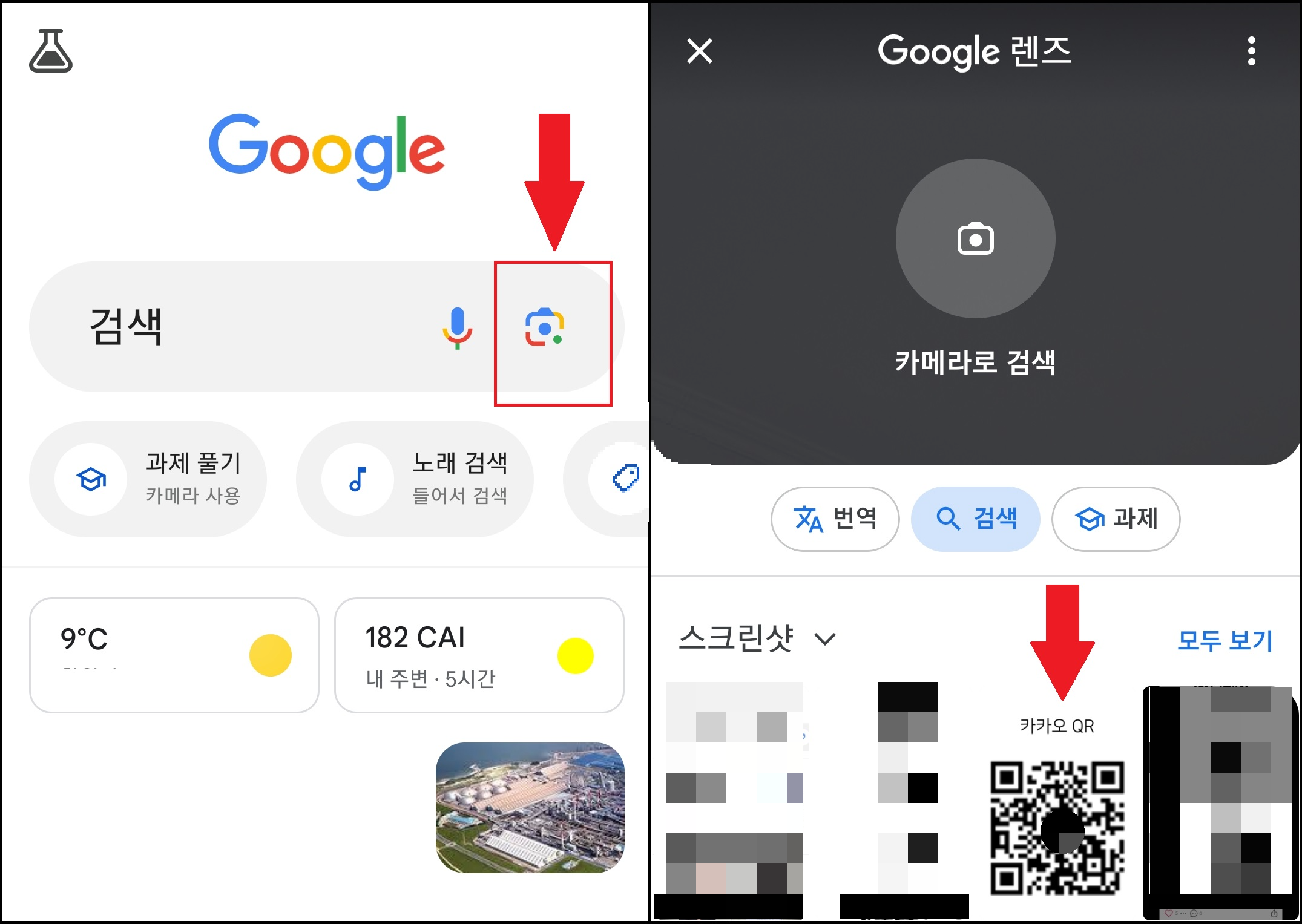 구글 홈화면에서 검색창에 있는 카메라 모양 아이콘을 클릭합니다. 그럼 구글 렌즈 화면이 나오면서 내 갤러리 화면이 나오는데요. 앞서 저장한 큐알코드 사진을 클릭해 줍니다.