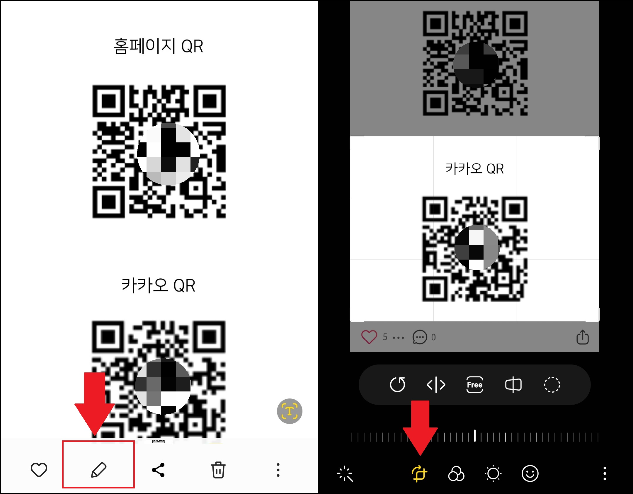 먼저 큐알코드를 스마트폰 캡처 기능을 통해 사진으로 저장을 해 줍니다. 편집 기능을 이용해 큐알코드 부분만 자르기 해 주면 인식이 더 잘 됩니다.
