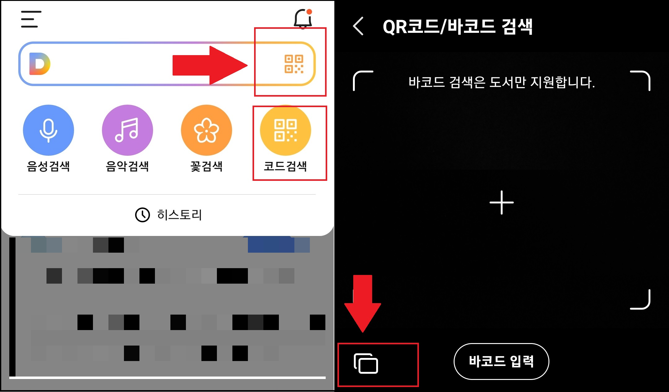 다음에서도 검색창에서 큐알코드를 읽을 수가 있습니다. 검색창에 있는 모자이크 모양의 아이콘을 누르면 큐알코드를 읽을 수 있는 항목이 나타납니다. 나타난 항목 중 코드검색을 클릭합니다. 네이버와 마찬가지로 큐알코드 검색 화면에서 왼쪽 하단의 겹친 네모 아이콘을 누르면 내 갤러리가 나타납니다. 큐알코드 사진을 클릭하면 연결된 사이트로 이동을 할 수 있습니다.