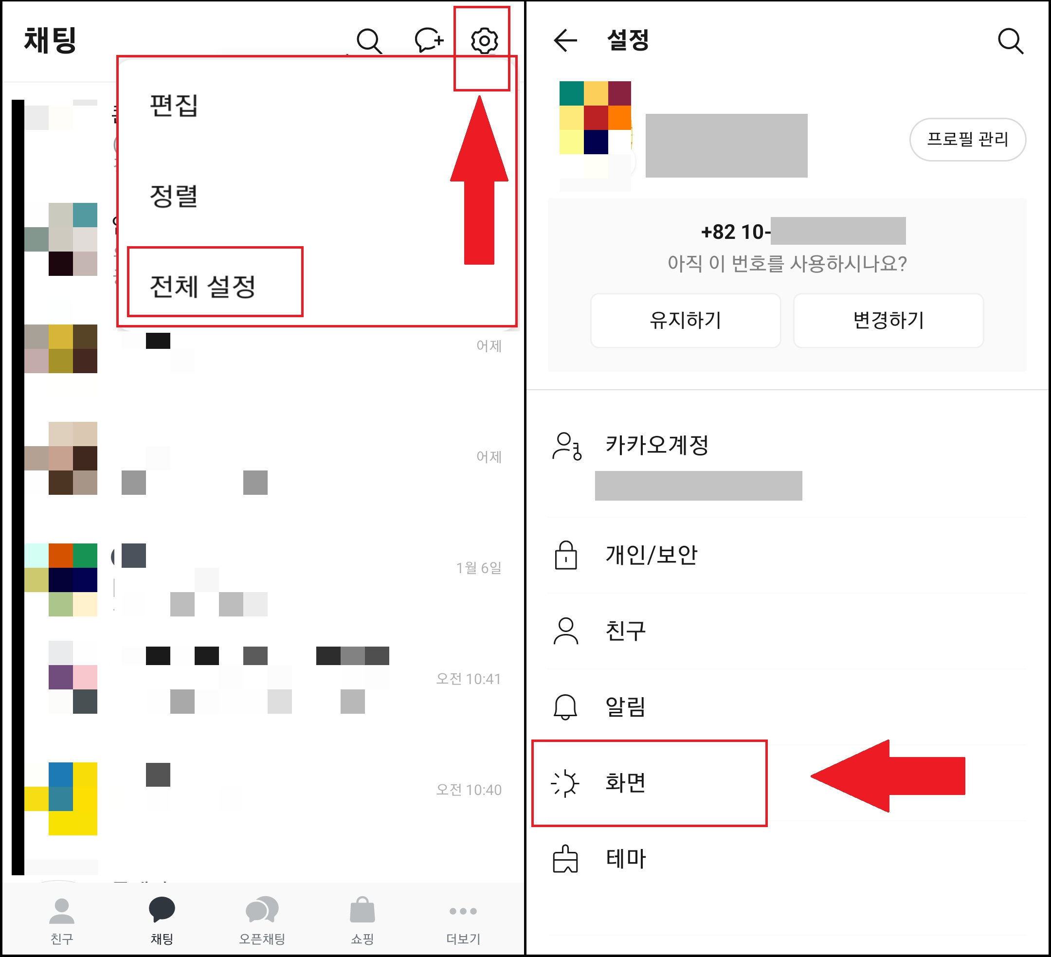 친구화면, 채팅 화면 상관없이 상단에 톱니바퀴 모양의 설정 아이콘이 있습니다. 설정을 눌러서 전체 설정을 클릭합니다. 여러 가지 설정 목록 중 화면을 클릭합니다.