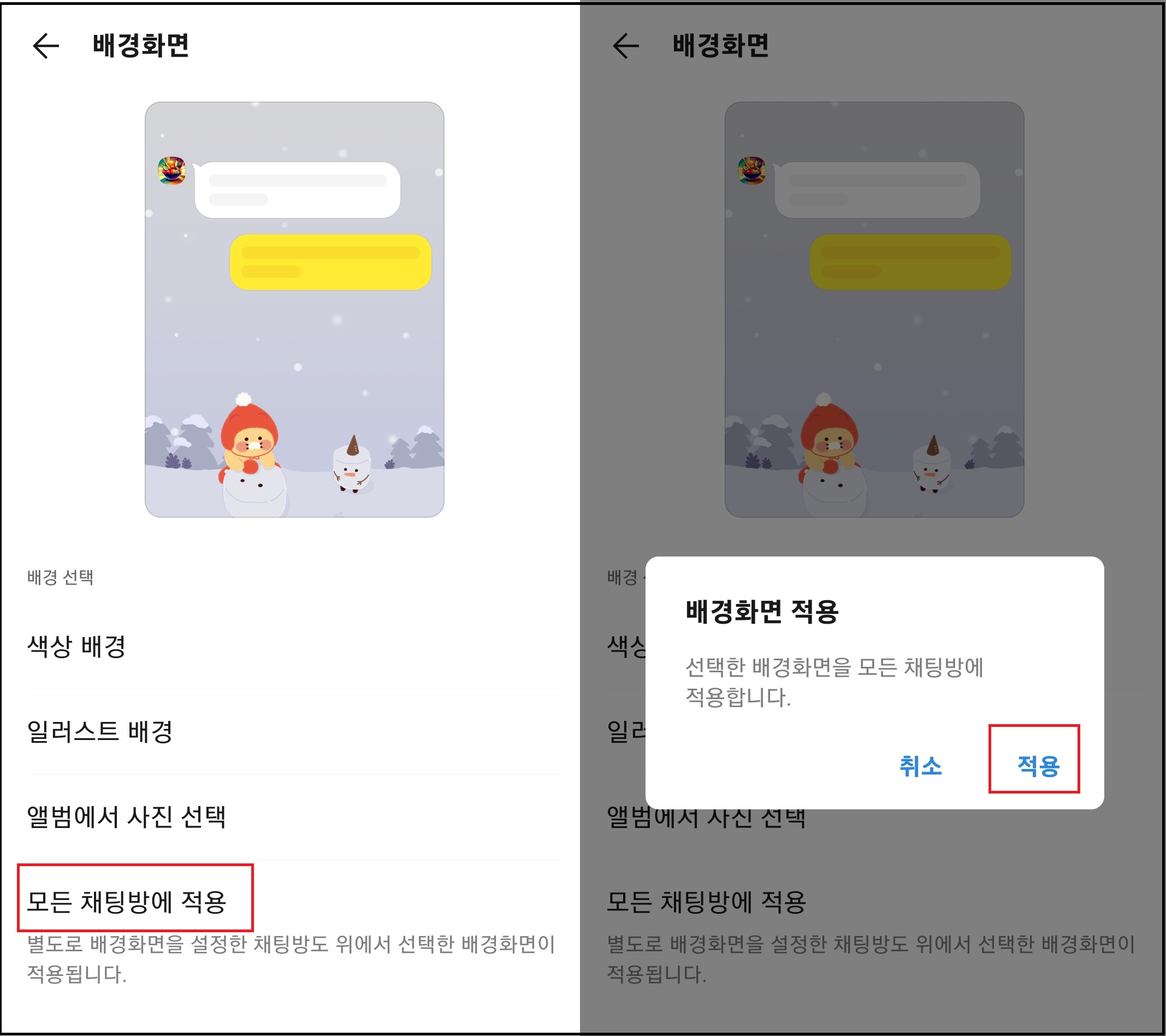배경을 바꾼 다음 되돌아 나와서 모든 채팅방에 적용을 누르면 완료됩니다.