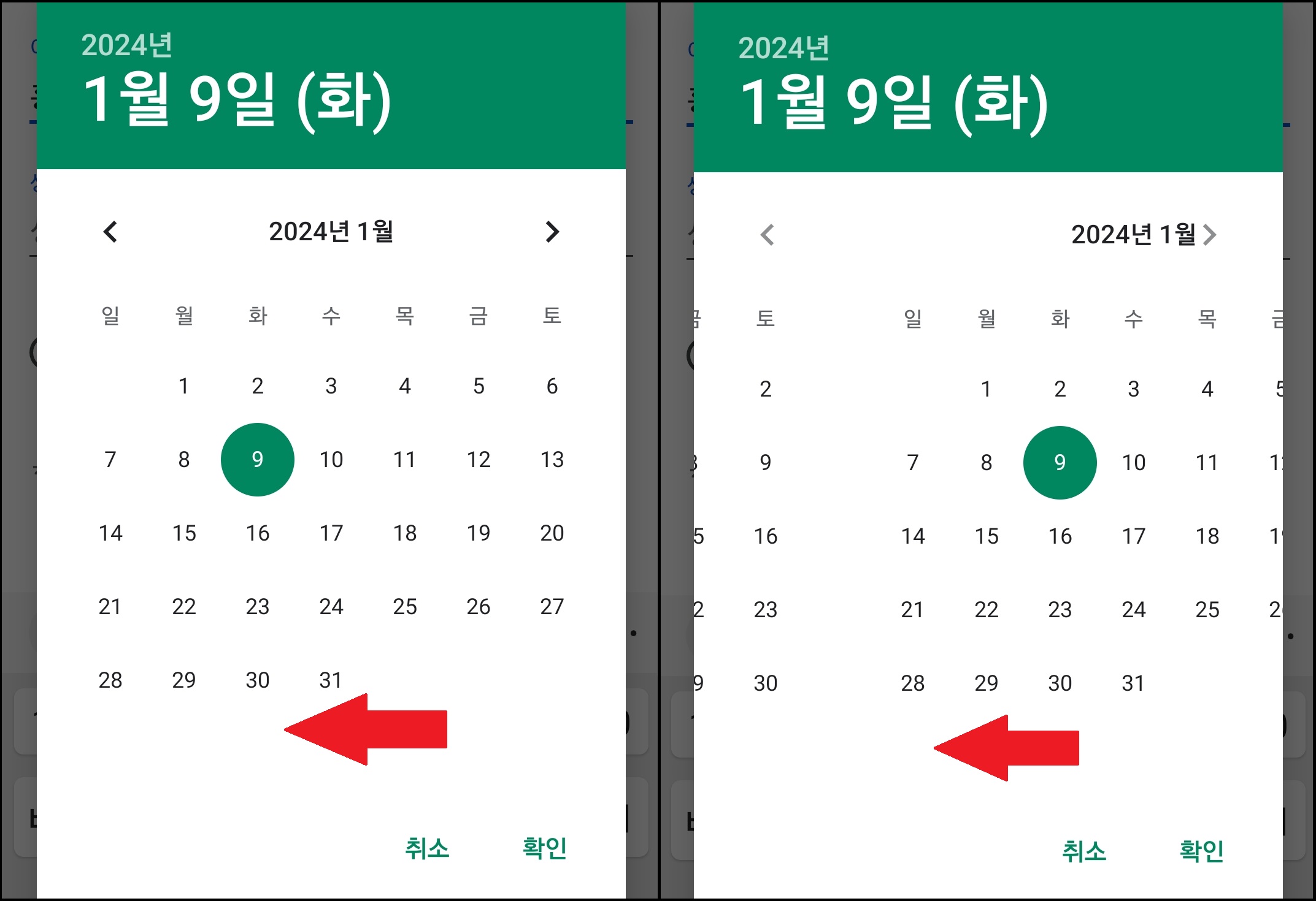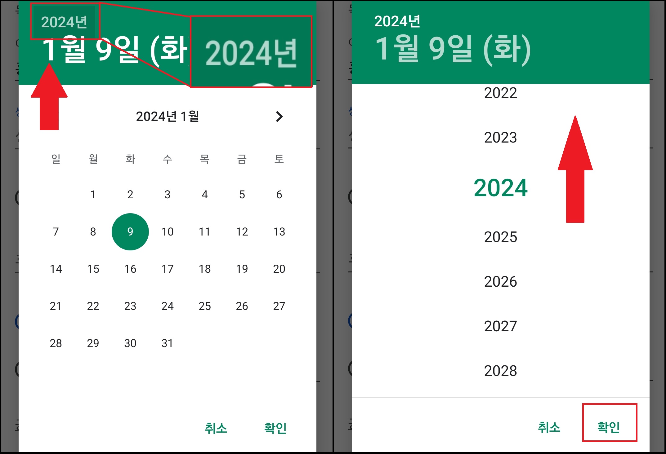 하지만 빠르게 연도를 거슬러 올라갈 수 있는데요. 달력을 자세히 보면 상단에 연도가 표시되어 있습니다. (월, 일)로 되어 있는 날짜를 클릭하는 게 아닌 그 위에 작은 글씨의 연도를 클릭해 줍니다. 그럼 오른쪽 이미지처럼 연도가 나타나 쉽게 몇십 년을 뛰어넘을 수 있습니다.
