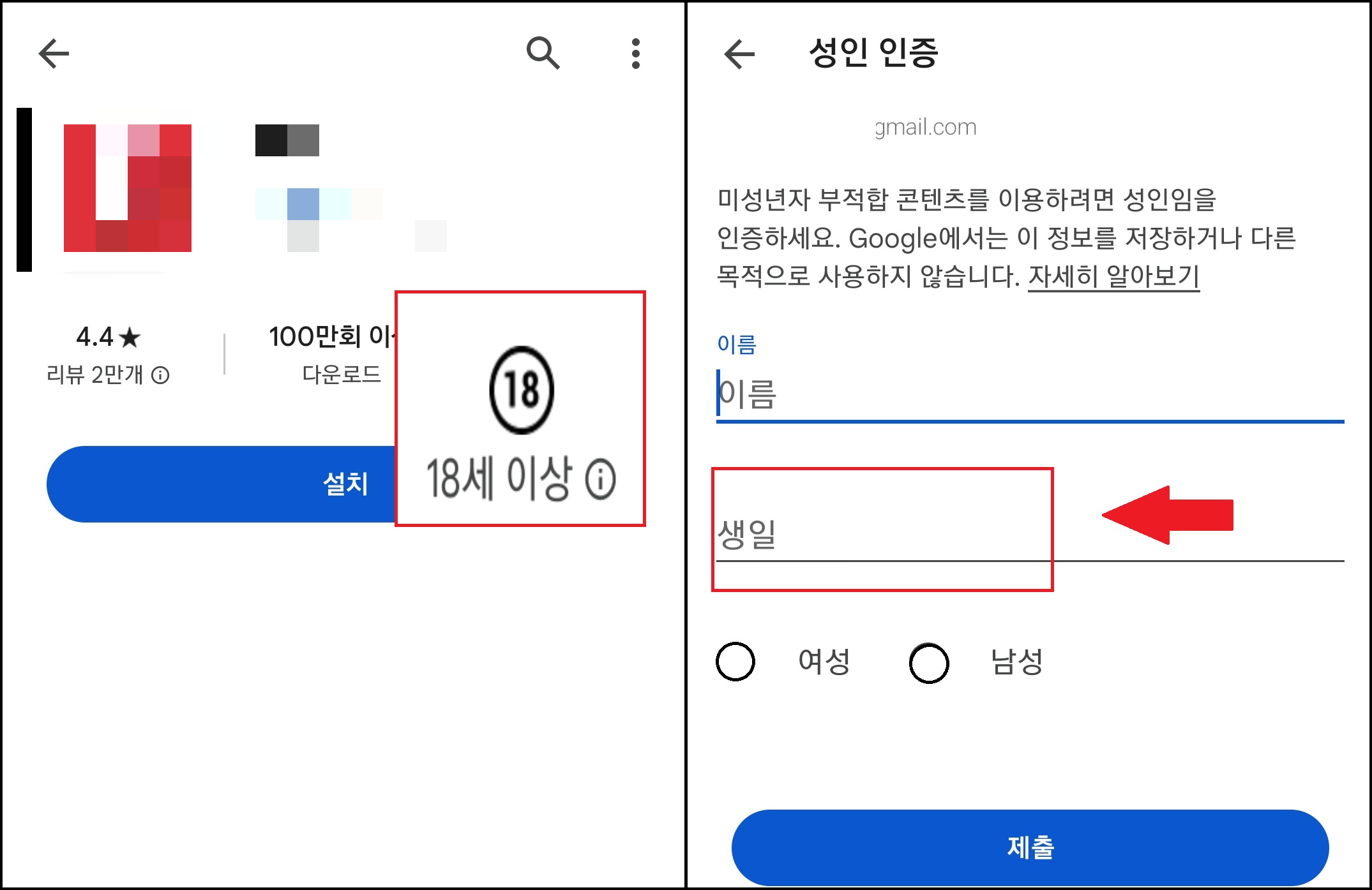 앱을 열면 오른쪽에 [18세 이상] 연령 표시가 나옵니다. 이는 성인 인증이 필요하다는 말인데요. 설치를 눌렀을 때 오른쪽 이미지와 같이 성인 인증이 나오게 됩니다. 여기서 이름을 입력하고 생일을 클릭하면 달력이 나타납니다.