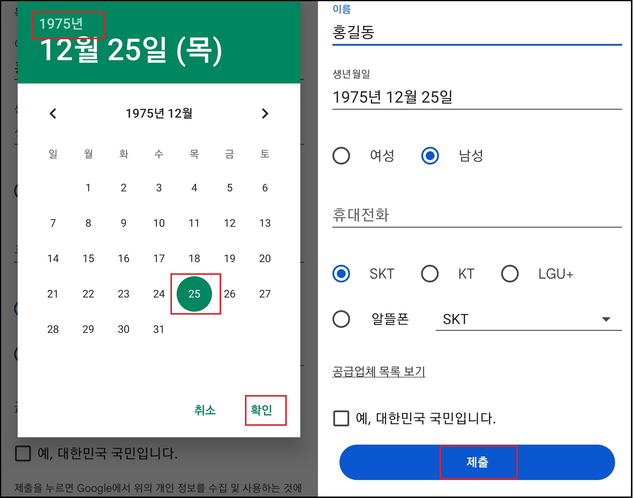 그렇게 연도를 선택하고 날짜까지 선택하고선 확인을 클릭합니다. 이제 성별을 체크와 휴대전화 인증을 하고 제출을 하면 인증 완료가 됩니다.
