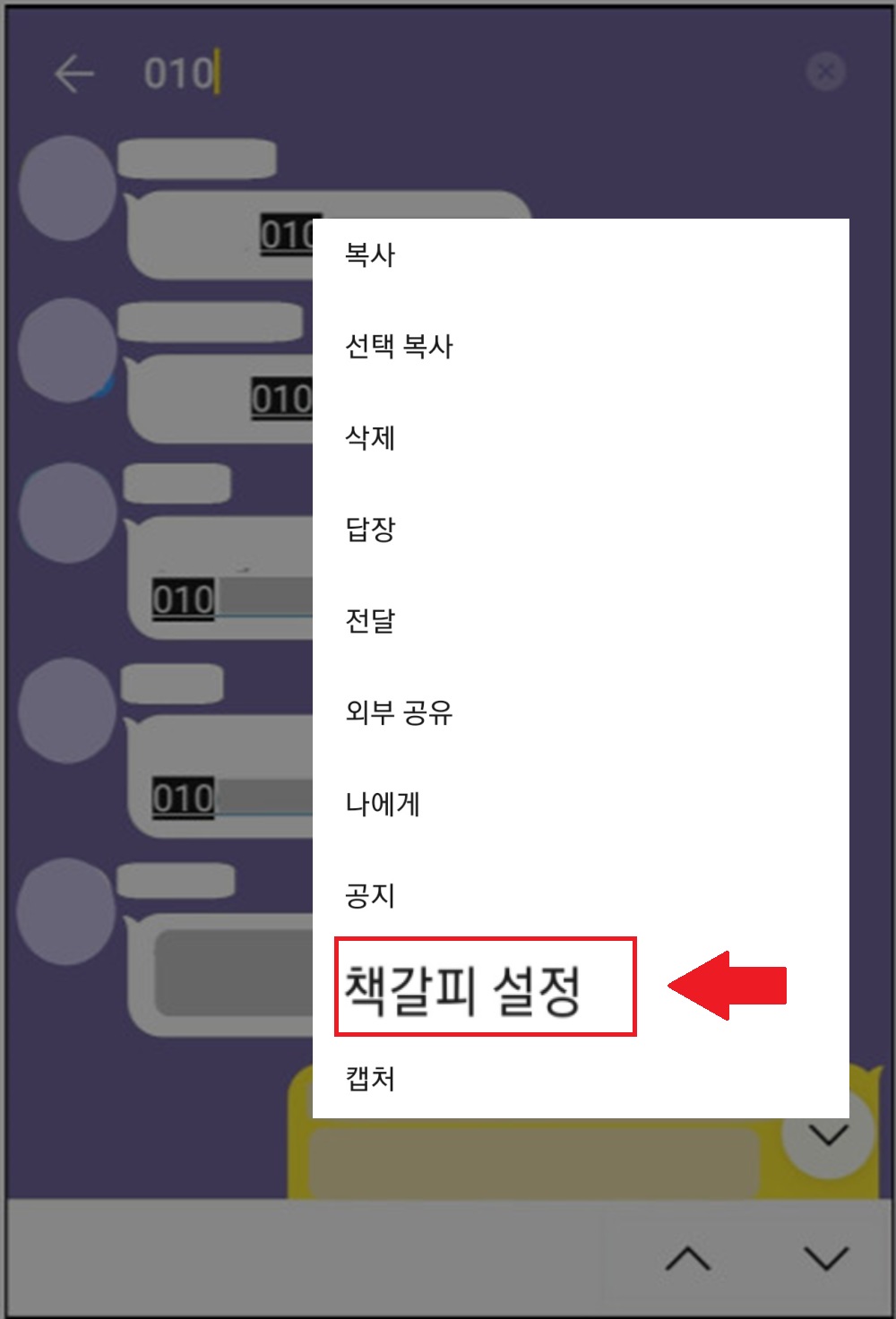 책갈피를 설정할 대화 내용을 길게 누르면 여러 가지 옵션이 나오는데요. 옵션 아래쪽에 책갈피 설정을 클릭하면 됩니다.