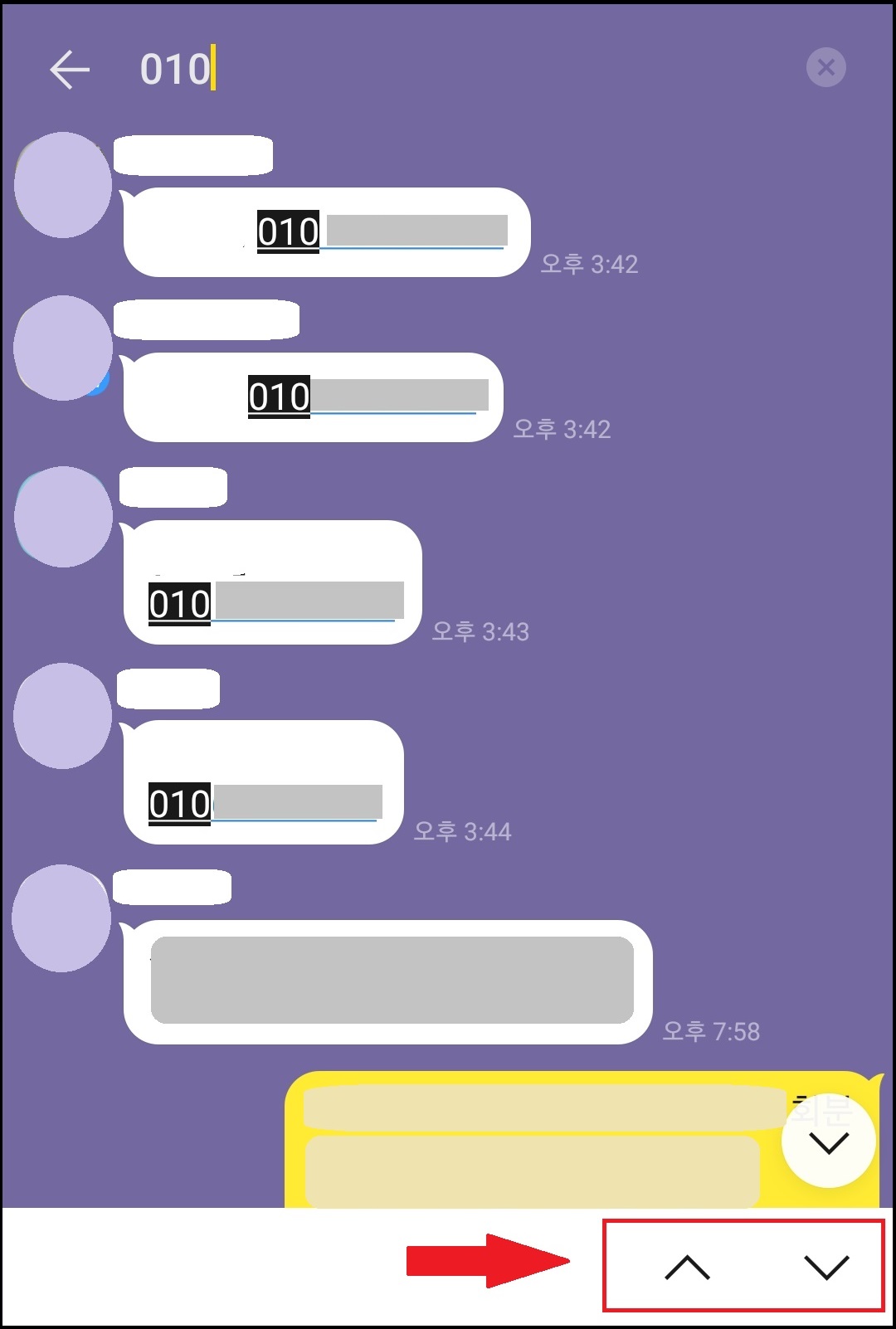 예를 들어, 전화번호 받았던 걸 찾아보면, 010으로 검색어를 입력합니다. 그럼 그 대화방에 있는 010과 관련된 대화 내용이 표시가 됩니다. 여러 개일 경우 화면 하단에 아래/위 화살표가 생기는데, 이를 클릭하면 그 단어들이 있는 위치로 한 단계씩 이동을 합니다.