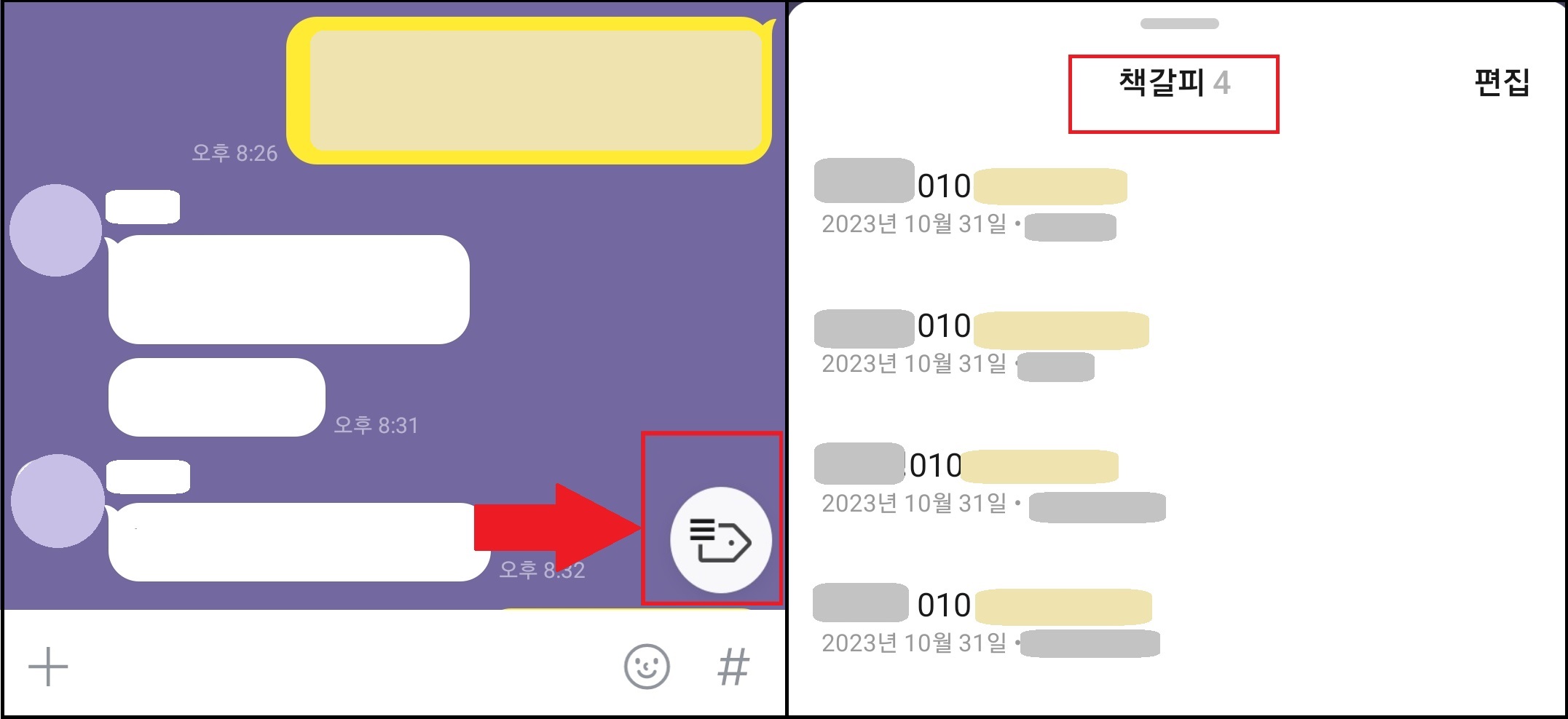 돋보기를 이용해서 대화 내용을 찾을 수 있지만 저장하여 바로가기를 만들 수도 있는데요. 그것은 책갈피 설정입니다.