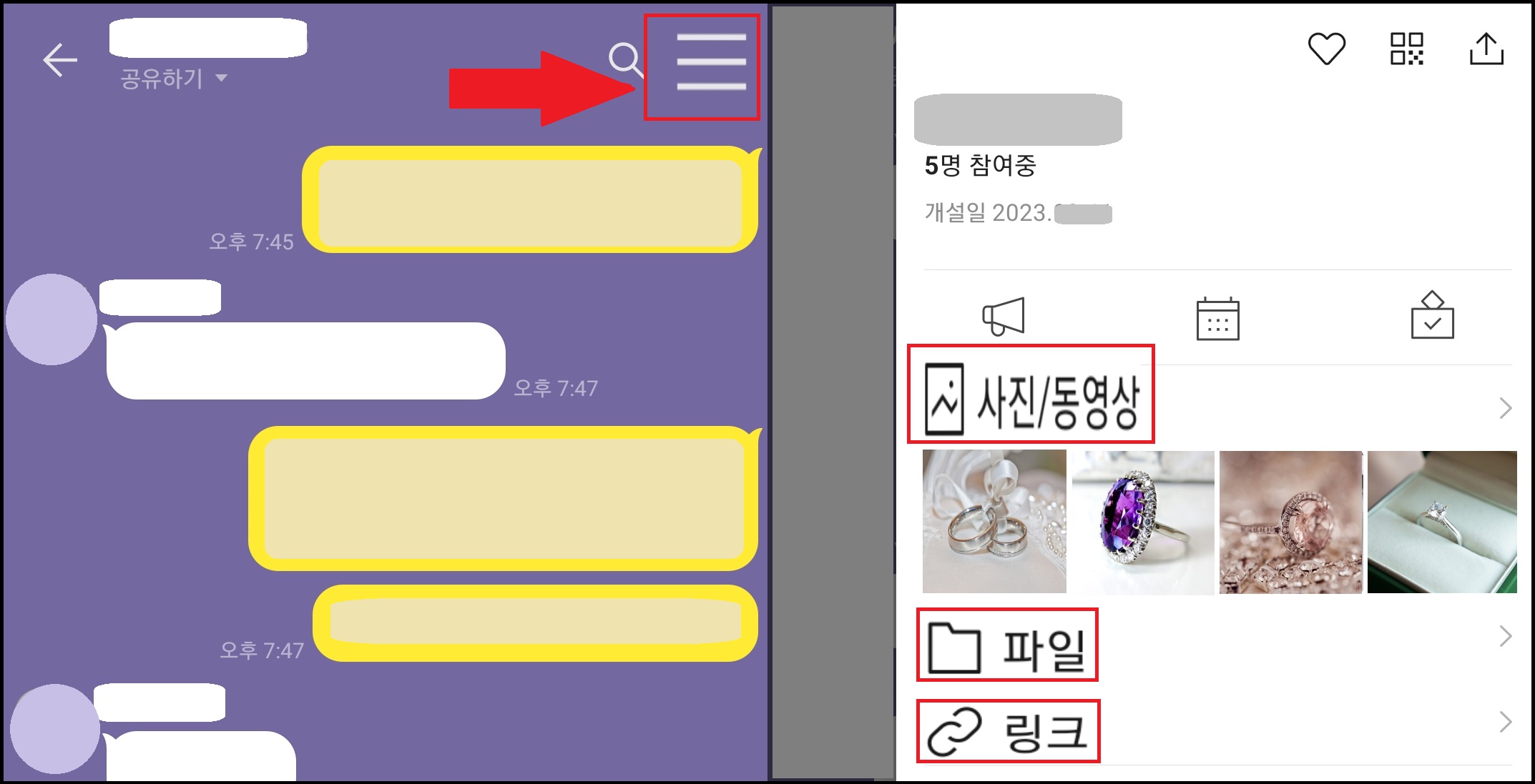 대화방에서 오른쪽 상단에 있는 삼선을 클릭하면 그 대화방에 올라왔던 사진이나 동영상이 나타납니다. 이를 한 번 더 클릭하면 지난 대화의 사진이나 동영상을 빠르게 찾을 수 있습니다. 또한 파일이나 링크 역시 클릭해서 바로 찾을 수 있습니다.