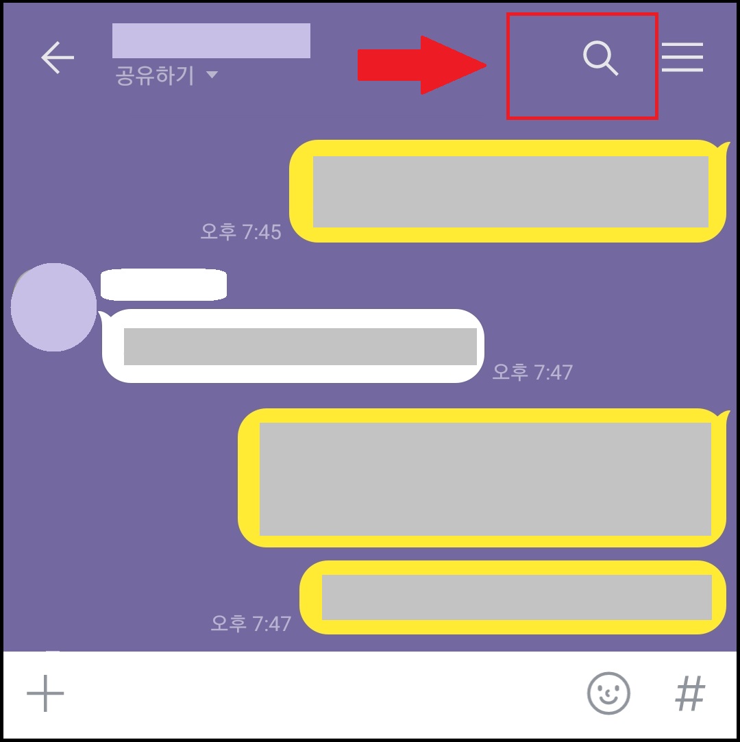 먼저 카카오톡 대화방에서 오른쪽 상단에 있는 돋보기 모양을 클릭합니다.