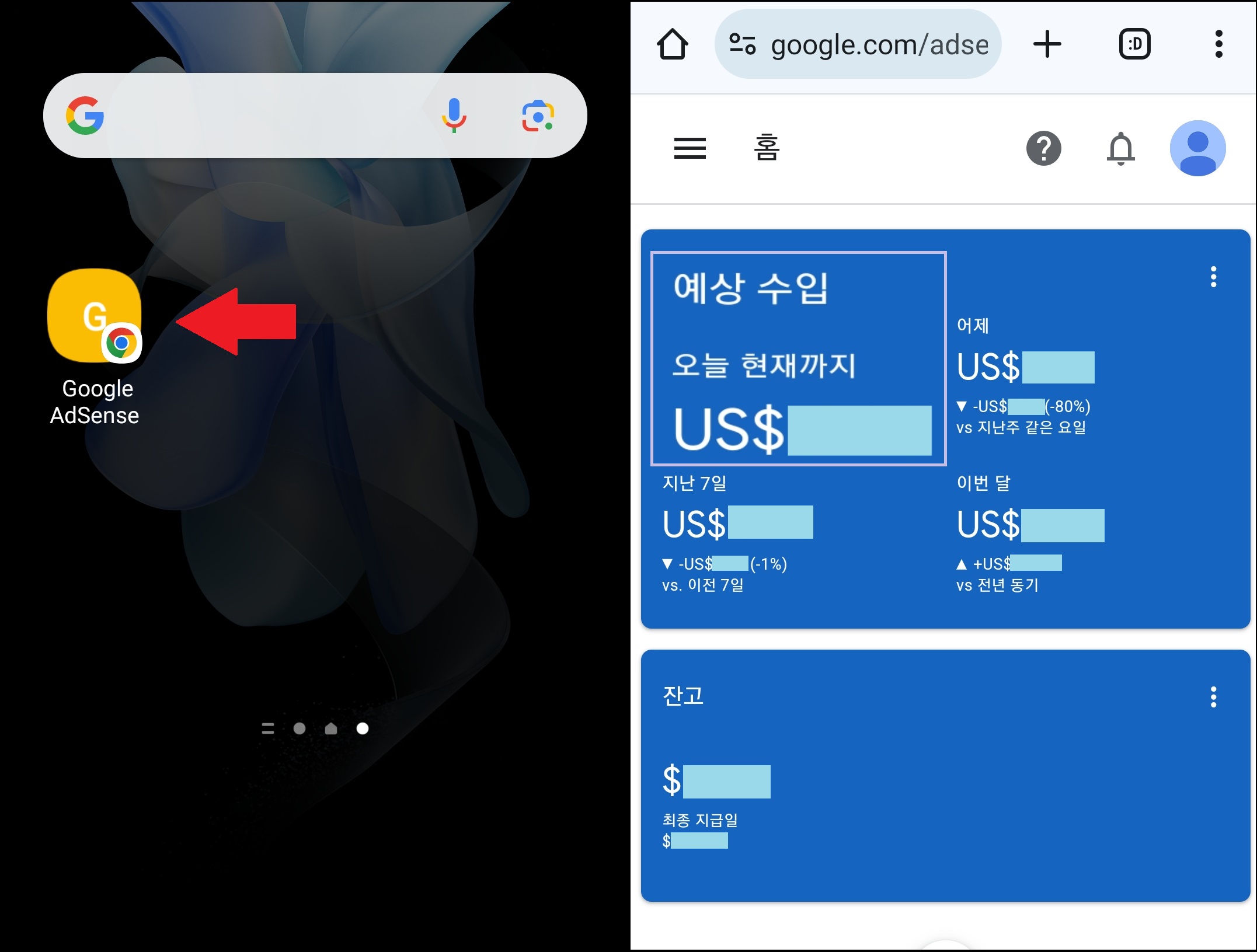 이제 스마트폰 홈화면에 구글 애드센스 바로가기 아이콘이 생성됐습니다. 로그인 상태이기 때문에 이 아이콘을 클릭하면 바로 수익화면을 볼 수가 있습니다.
