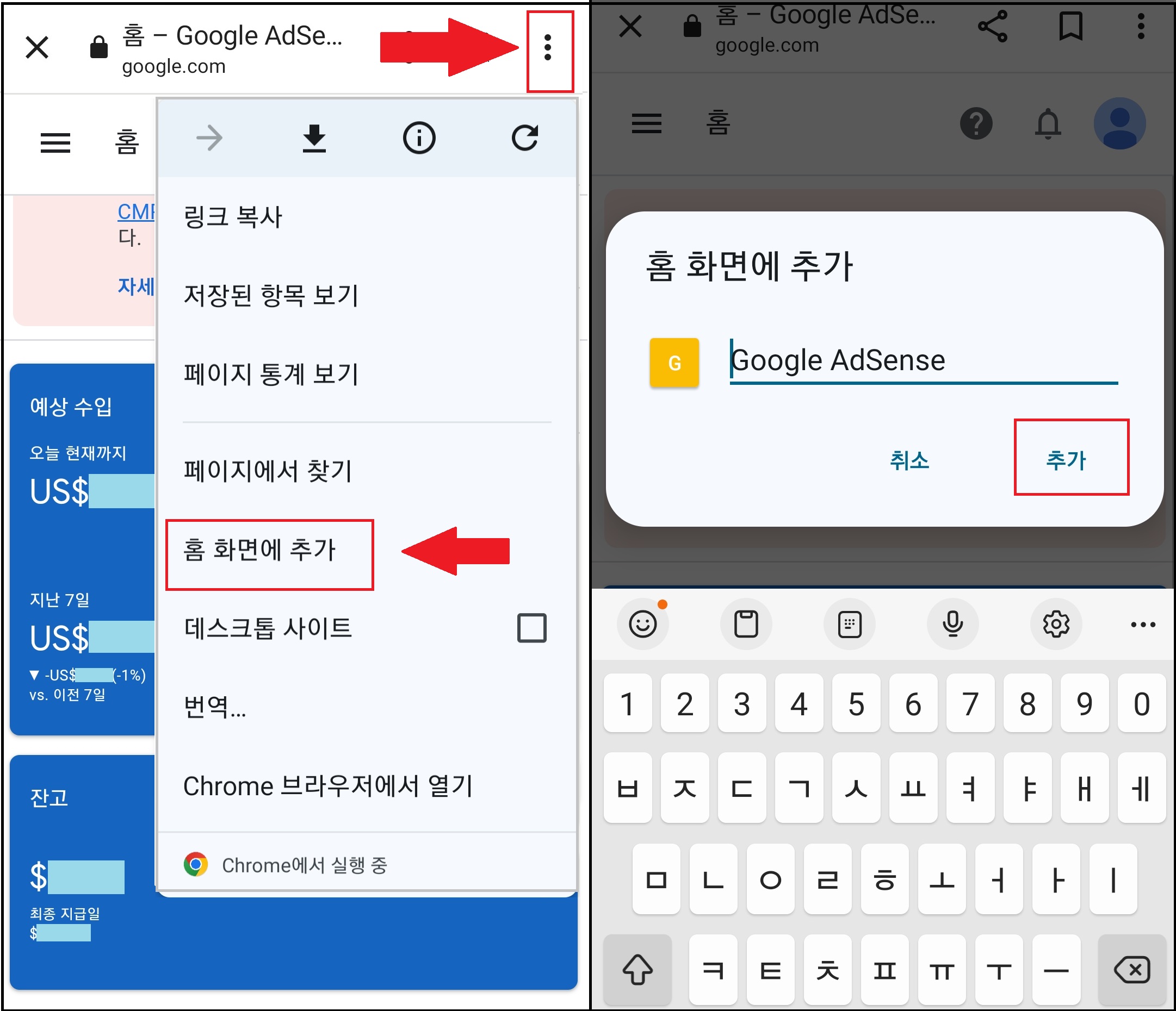 구글 애드센스 홈화면에서 오른쪽 상단에 있는 점 세 개를 클릭합니다. 그럼 여러 가지 옵션이 나오는데요. 이중 홈화면에 추가를 클릭해 줍니다. 이름을 설정하고 추가를 클릭합니다.