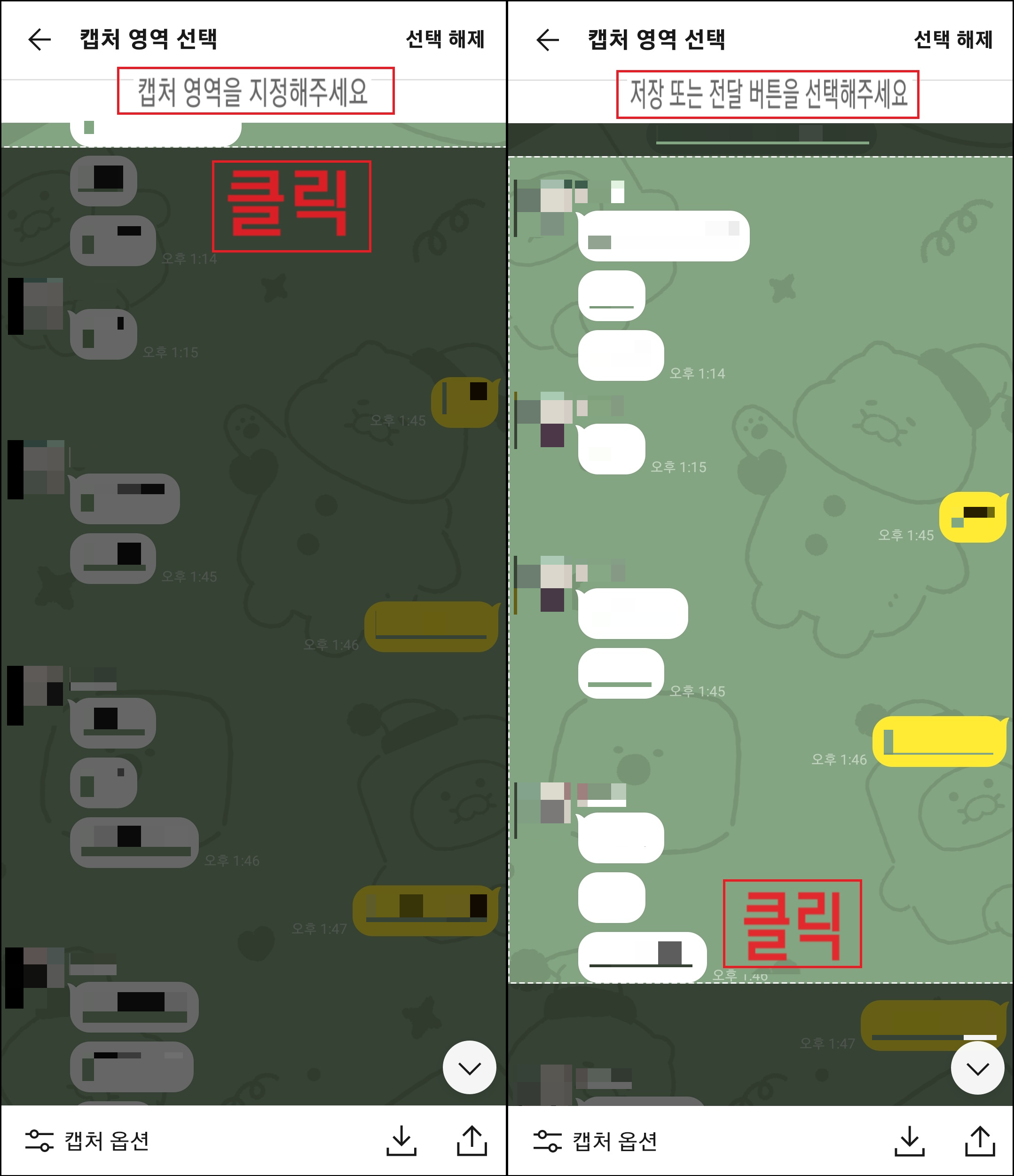 카카오톡 캡처는 한 가지 장점이 있는데요. 스마트폰 화면에 보이는 부분만이 아닌 그 이상 혹은 그 이하의 영역까지 캡처가 된다는 것입니다. 캡처 화면에서 폰화면을 아래위로 스크롤해서 시작 부분의 내용, 또는 끝부분의 내용을 클릭하면 시작 내용부터 끝부분 내용까지 캡처가 됩니다.