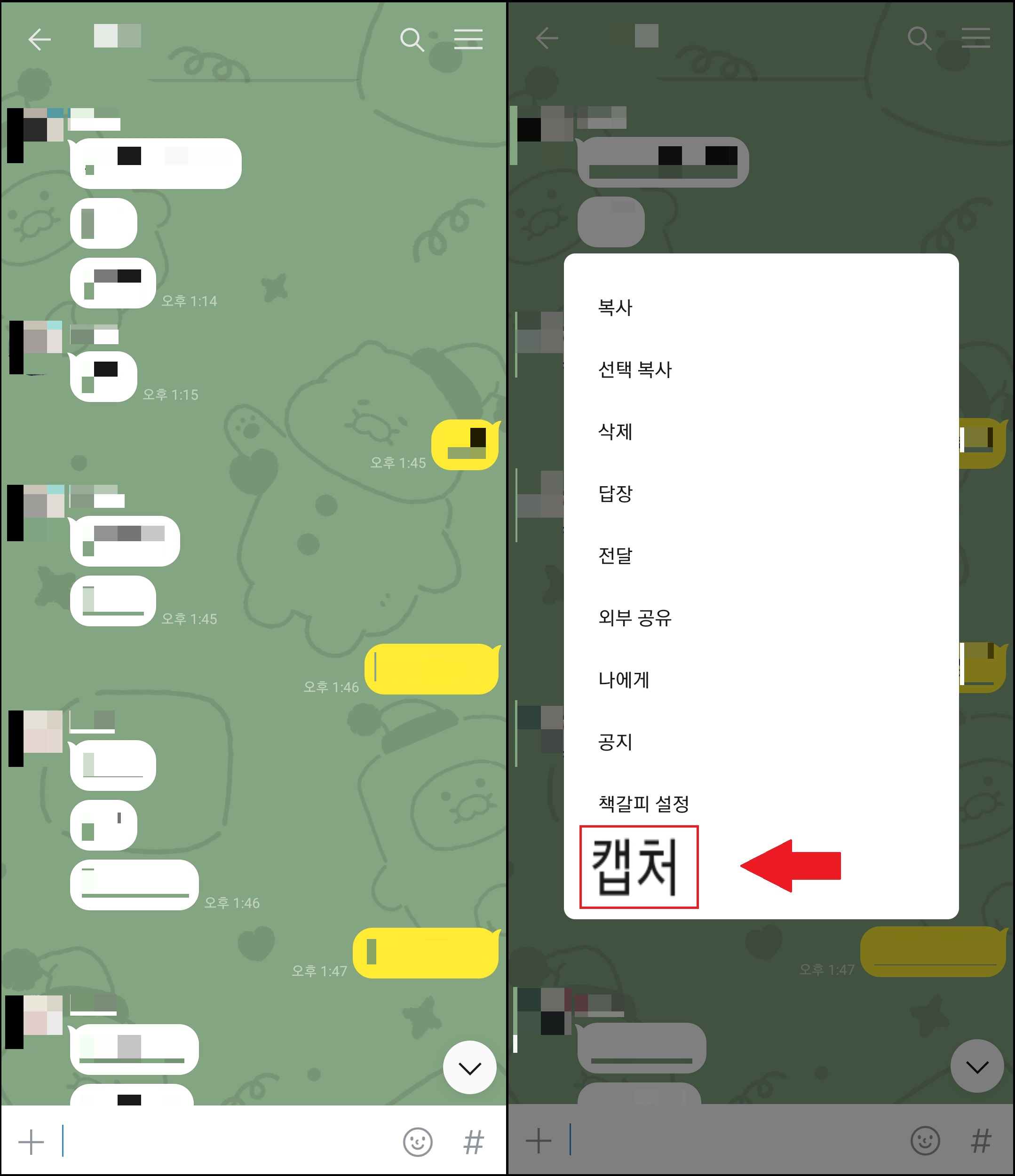 먼저 대화창으로 들어온 상태에서 캡처할 부분의 내용 하나를 길게 눌러 줍니다.