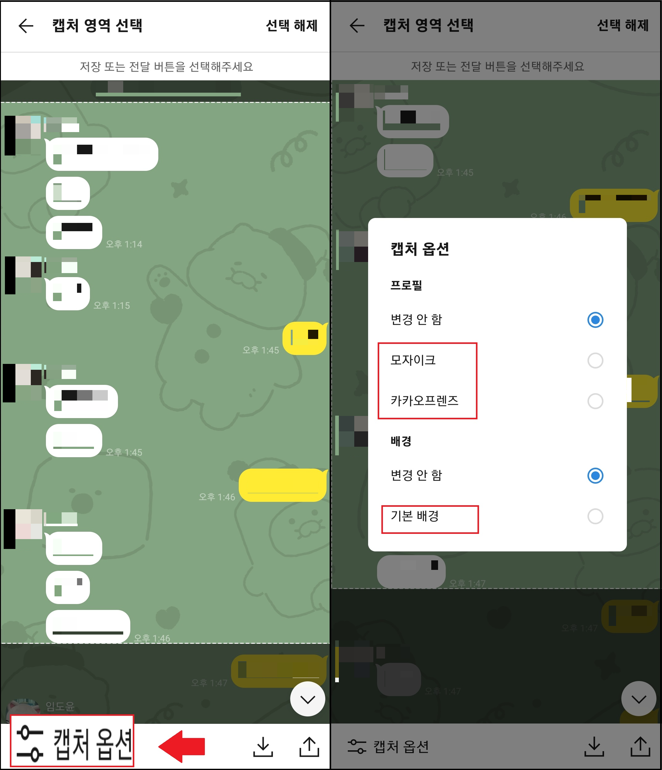 캡처영역을 잡은 상태에서 왼쪽 하단의 캡처 옵션을 클릭하면 프로필 모양을 변경할 수 있고, 배경을 변경할 수도 있습니다.