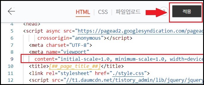 이렇게 수정된 것을 한번 더 확인하고 오른쪽 상단에 있는 적용을 클릭합니다. 이제 티스토리 블로그의 글을 열었을 때 손가락으로 확대 축소 하는 것이 자연스러워졌음을 알 수 있을 것입니다.