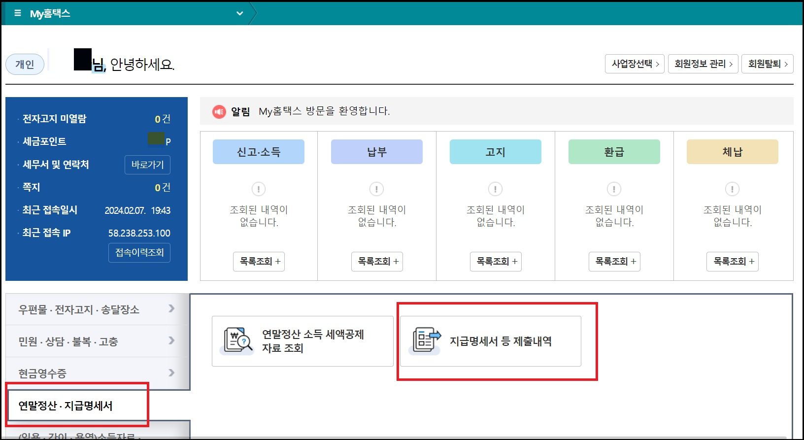 개인정보 화면에서 왼쪽 목록 중 연말정산·지급명세서를 클릭합니다. 나타나는 목록 중 지급명세서 등 제출내역을 클릭합니다.