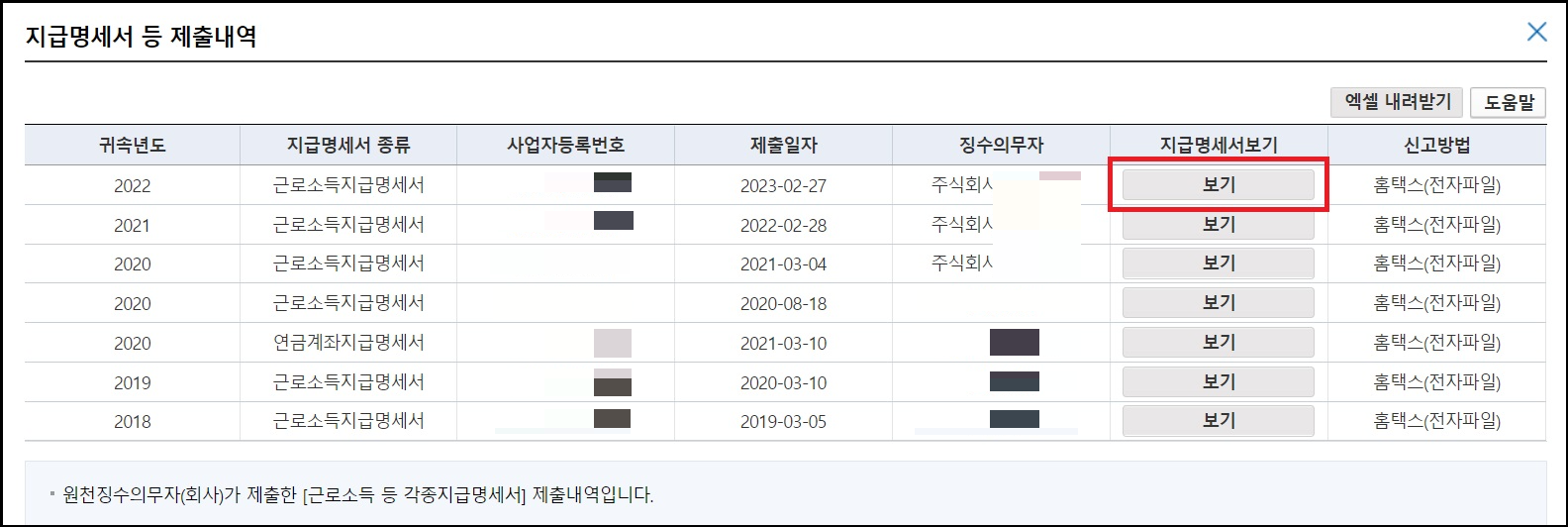 지급명세서 등 제출내역을 클릭하면 근로소득지급명세서와 퇴직금이 지급되었을 경우 연금계좌지급명세서까지 회사에서 제출되었던 소득자료들이 나타납니다. 여기서 보기(미리보기)를 클릭합니다.