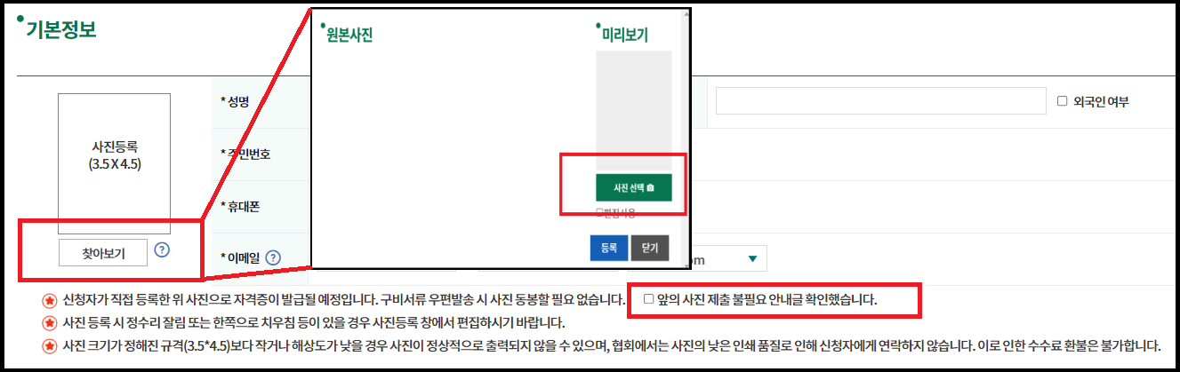 · 사진 크기가 정해진 규격(3.5*4.5) 보다 작거나 해상도가 낮을 경우 사진이 정상적으로 출력되지 않을 수 있으며, 협회에서는 사진의 낮은 인쇄 품질로 인해 신청자에게 연락하지 않습니다. 이로 인한 수수료반환은 불가합니다.