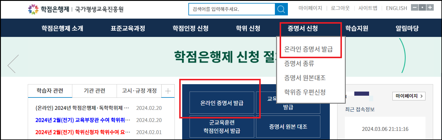 로그인 후 홈페이지 중단의 온라인 증명서 발급이나 상단 목록 중 증명서 신청의 온라인 증명서 발급을 클릭합니다.