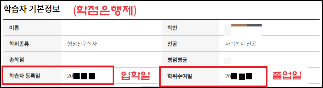 입학일은 학점은행 학습자 등록일이고, 졸업일은 학점은행 학위수여일 입니다.