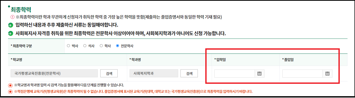 최종학력의 입학일과 졸업일은 학점은행제 이수자의 경우,