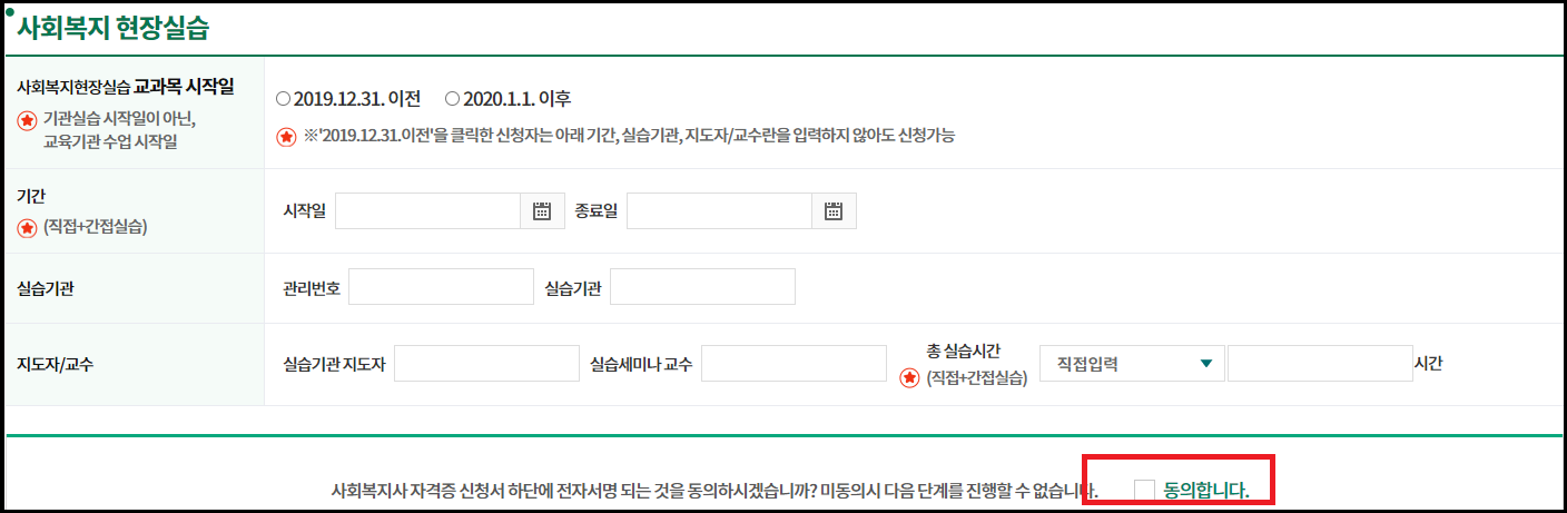 마지막으로 현장실습 확인서를 바탕으로 현장실습 정보를 입력해 줍니다. 모든 정보를 다시 확인하고 동의에 체크를 하면 신청 완료입니다.