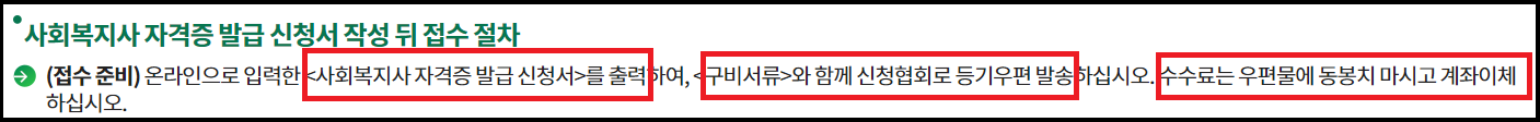 이제 온라인으로 입력한 <사회복지사 자격증 발급 신청서>를 출력하여 <구비 서류>와 함께 신청 협회로 등기우편 발송 합니다. 수수료(7만원)는 우편물에 동봉하지 말고 계좌이체를 합니다. 수수료 입금시 유의사항은 입금자명에 동명이인 구분을 위해 이름과 생년월일 6자리를 입력합니다.