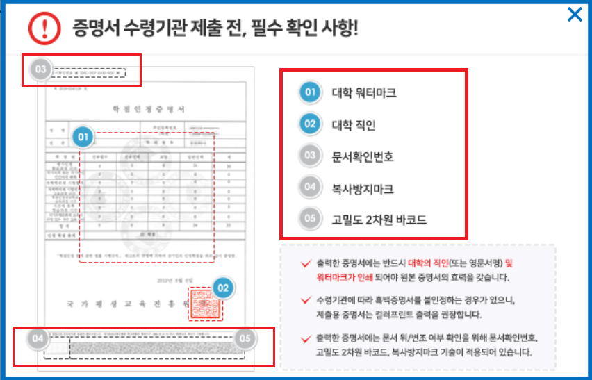증명서 제출 전 필수사항을 보면, 대학 또는 학점은행제 워터마크와 직인이 나오는지 확인해야 합니다. 이는 원본 증명서의 효력을 갖습니다. 또한 수령기관에 따라 흑백증명서를 불인정하는 경우가 있으니 제출용 증명서는 컬러프린트 출력을 권장합니다. (컬러/흑백 프린트 가능 여부는 제출기관에 문의할 수 있습니다.) 가장 중요한 부분은 출력증명서 상단에 나오는 문서확인번호와 증명서 하단에 나오는 복사방지마크와 고밀도 2차원바코드가 제대로 나왔는지 확인해야 합니다.