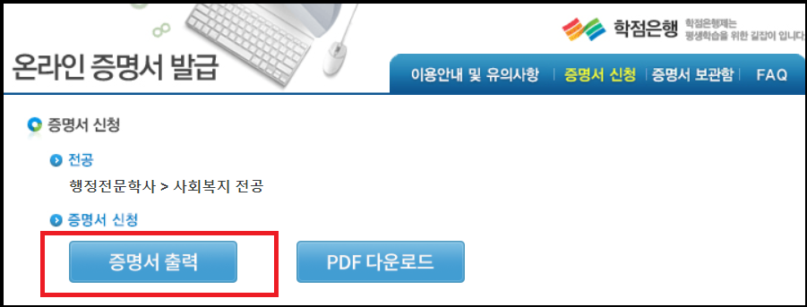 온라인 증명서 발급 팝업창에서 단계에 따라 진행할 수 있습니다. 위와 같은 화면에서 PDF 파일 다운로드는 파일 보관용이므로 자격증 신청을 위한 제출용으로는 증명서 출력을 선택합니다.(증명서 1통당 500원, 결제한 만큼 출력할 수 있습니다.)