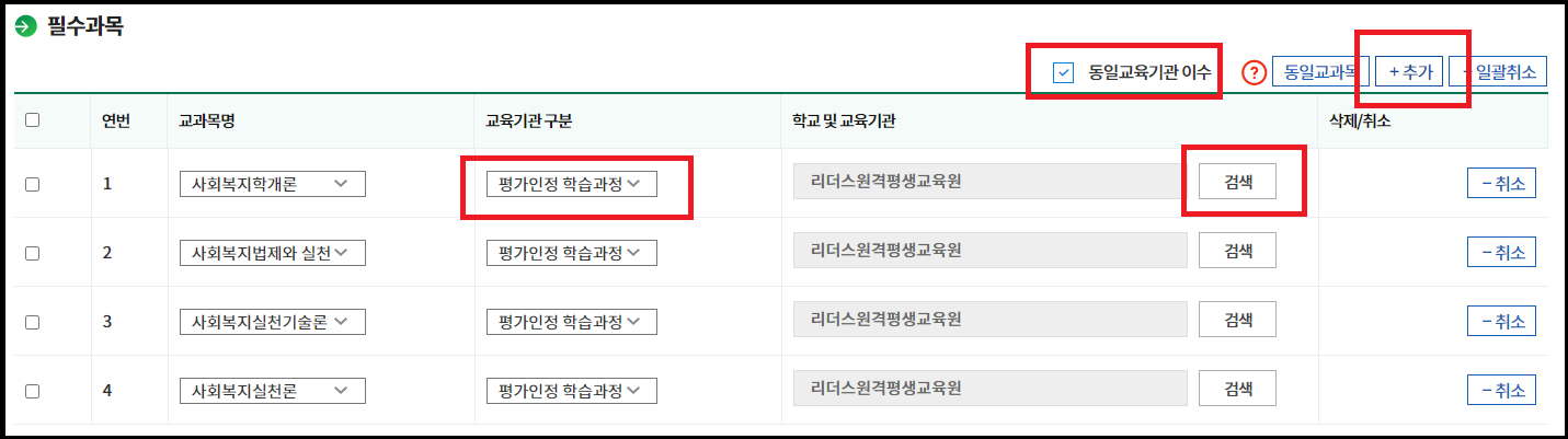 필수과목(10과목)에서는 동일기관에서 했을 경우 동일교육기관 이수를 체크하고 추가를 클릭합니다.