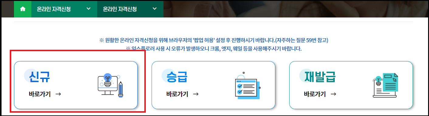 협회 홈페이지에서 로그인 후 온라인 자격증 신청 바로가기를 클릭하거나 상단 목록 중 온라인 자격신청을 클릭합니다.