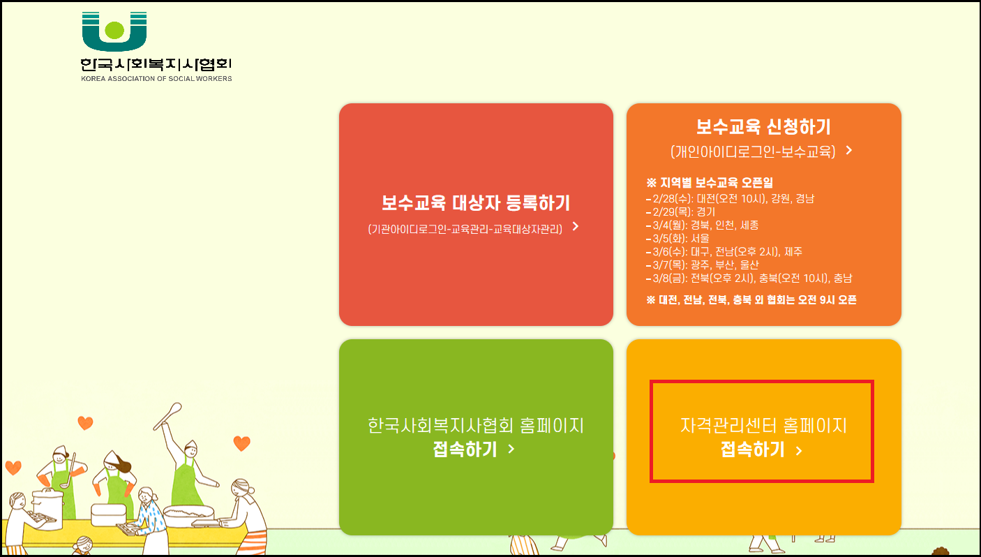 한국사회복지사협회 홈화면에서 자격관리센터 홈페이지를 클릭합니다. 또는 한국사회복지사협회 자격관리센터라고 검색할 수 있습니다.